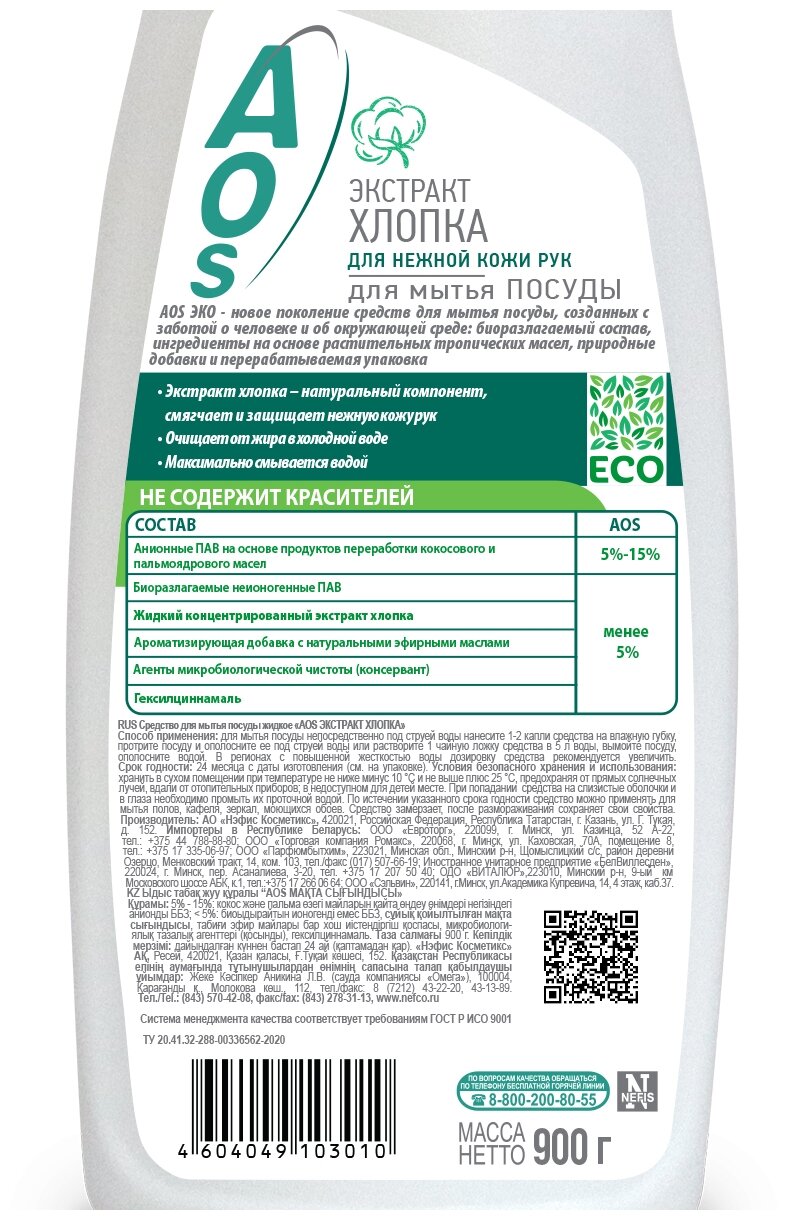 Гель для мытья посуды AOS с экстрактом хлопка 450г