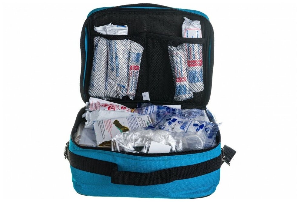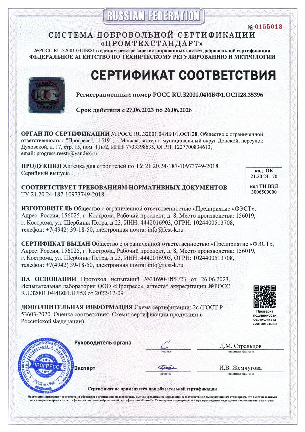 Для оказания первой помощи работникам на строительных площадках. ТУ 21.20.24-187-10973749-2018 Материал футляра: текстиль. Габаритные размеры: 280х225х130 мм. Состав: 1. Темпалгин, табл. №20 1 уп. 2. Валидол, табл. 60 мг №10 1 уп. 3. Уголь активированный, табл. 250 мг №10 2 уп. 4. Анальгин, табл. 500 мг №10 2 уп. 5. Ацетилсалициловая кислота, табл. 500 мг №10 2 уп. 6. Сульфацил-натрия раствор 20%, 5 мл или 10 мл флакон-капельница 1 уп. 7. Нитроглицерин, табл. 500 мкг №40 или капсулы 500 мкг №20 1 уп. 8. Хлоргексидина водный раствор 0,05%, 100 мл 1 фл. 9. Йода спиртовой раствор 5%, 10 мл 1 фл. 10. Мазь «Левомеколь», 40 г 1 уп. 11. Перекиси водорода раствор 3%, 40 мл 1 фл. 12. Бинт марлевый медицинский стерильный 5 м х 10 см 3 шт. 13. Бинт марлевый медицинский стерильный 7 м х 14 см 3 шт. 14. Бинт эластичный трубчатый медицинский нестерильный № 1, 3, 6 по 1 шт. 15. Лейкопластырь фиксирующий 5 х 500 см 1 шт. 16. Салфетки марлевые медицинские стерильные 16 х 14 см №10 1 уп. 17. Салфетка «Колетекс» с хлоргексидином с липкими краями 10 х 14 см 2 шт. 18. Салфетка «Колетекс» с прополисом и фурагином 6 х 10 см 2 шт. 19. Жгут кровоостанавливающий 1 шт. 20. Ножницы универсальные 1 шт. 21. Гипотермический (охлаждающий) пакет 3 шт. 22. Вата медицинская нестерильная, 50 г 1 шт. 23. Устройство для проведения искусственного дыхания «Рот-Устройство-Рот» 1 уп. 24. Комплект заготовок шин транспортных разового использования ЗШТ-1 2 уп. 25. Покрывало спасательное.