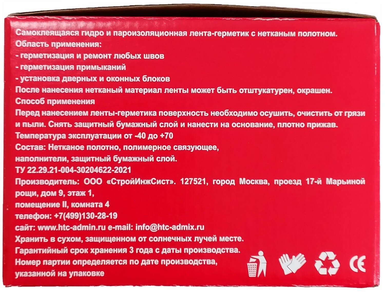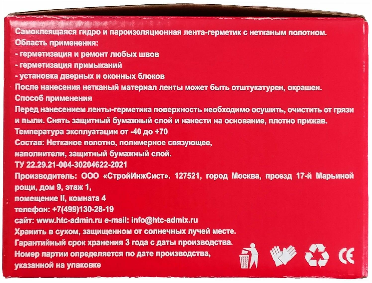 Самоклеящаяся полимерная лента-герметик НТС для швов и примыканий - это самоклеящаяся лента с покрытием из нетканого полотна. Лента применяется для герметизации и ремонта любых швов, примыканий при установке дверей и оконных блоков. Подходит для работ внутри и снаружи помещений. Легко и быстро устанавливается. После применения лента может быть отштукатурена и окрашена. Не требует специальных защитных средств для рабочего персонала. Срок эксплуатации до 25 лет.