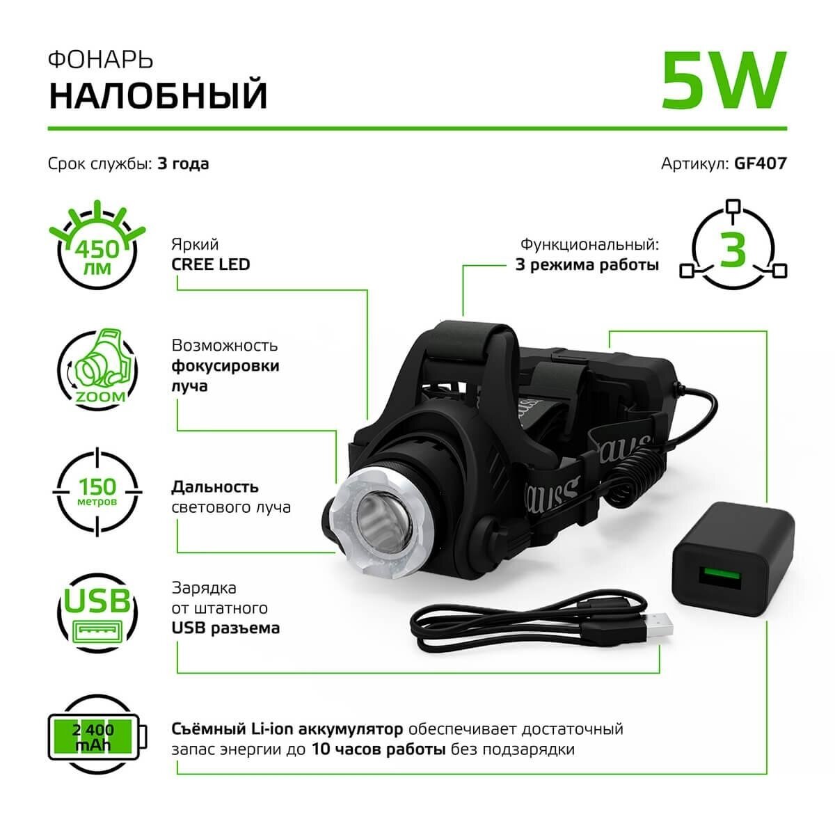 Модель: Фонарь LED налобный GFL407 5W 450lm Li-ion 2400mAh