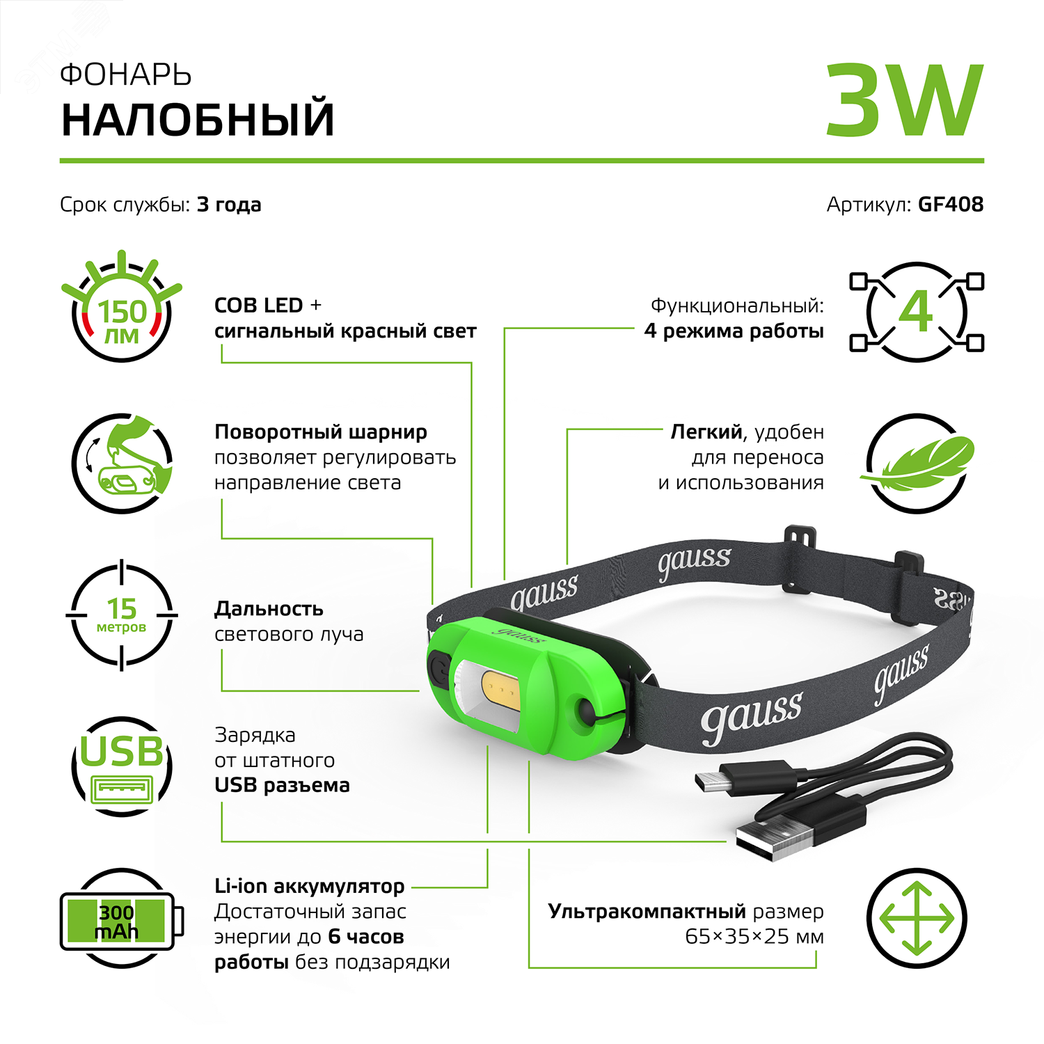 Налобный фонарь Gauss Фонарь LED налобный GFL408 3W 150lm Li-ion 300mAh