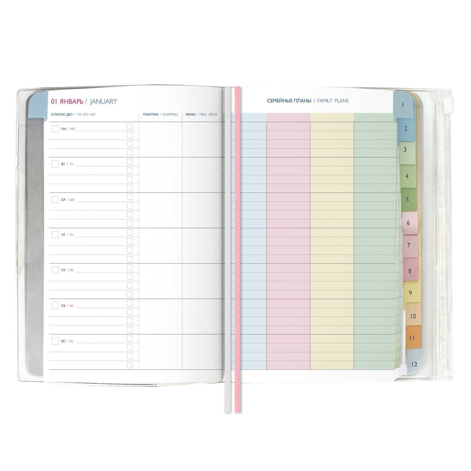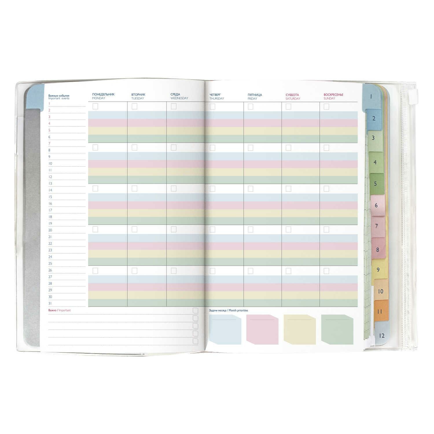 Особенности: вырубка блока по месяцам, карманы для визиток и документов, петля для ручки, съёмная обложка, функциональный карман на молнии как часть задней обложки.