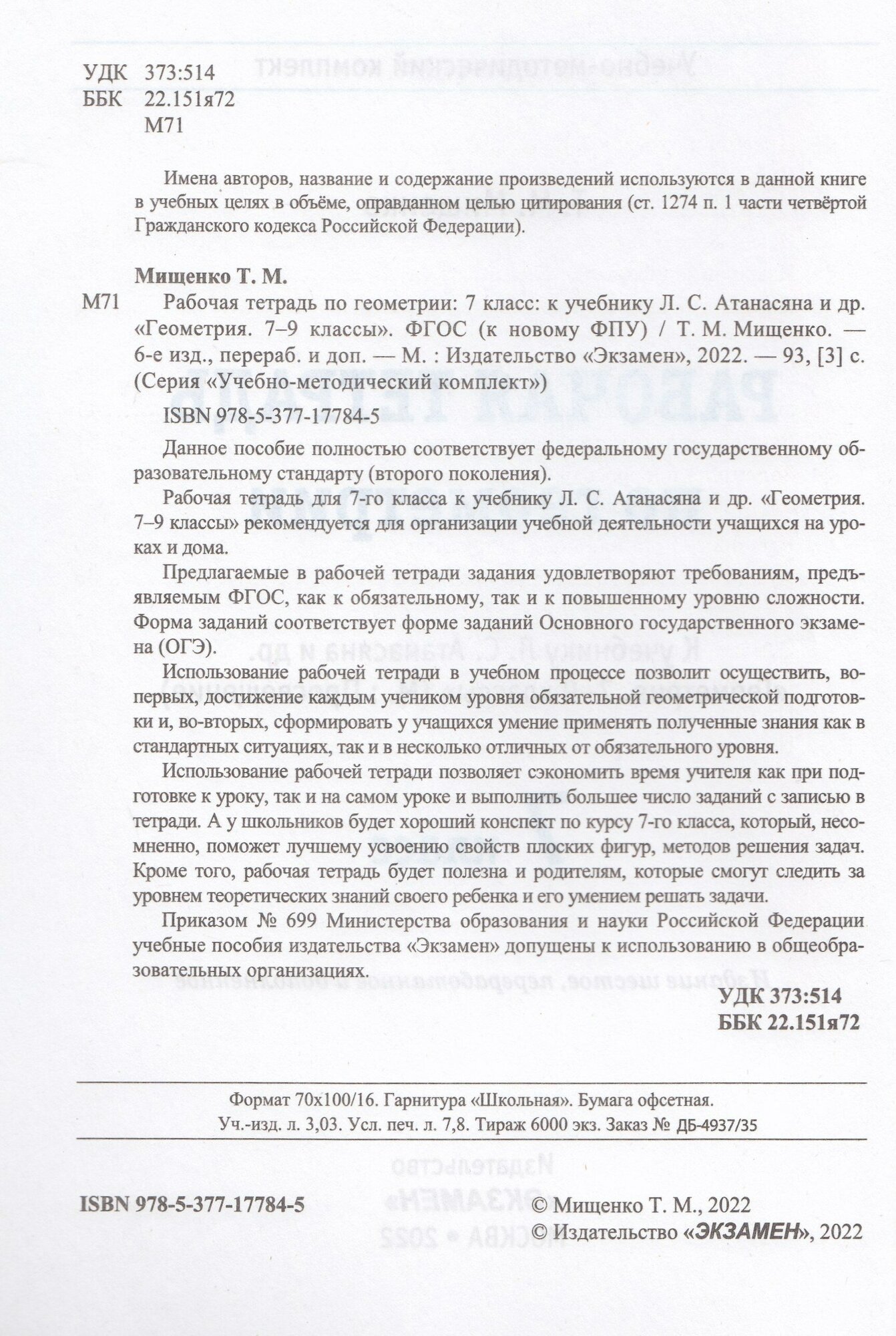 Сервис сравнения цен СкидкаГИД предлагает сравнить цены на товар «Книга: Рабочая тетрадь по геометрии 7 класс К учебнику Л С Атанасяна и др Геометрия 7-9 классы М Просвещение (Мищенко Татьяна Михайловна); Экзамен, 2022»