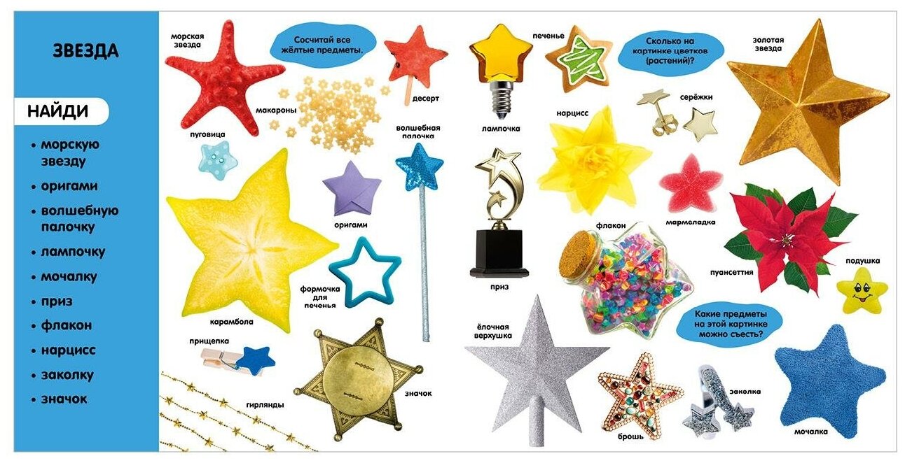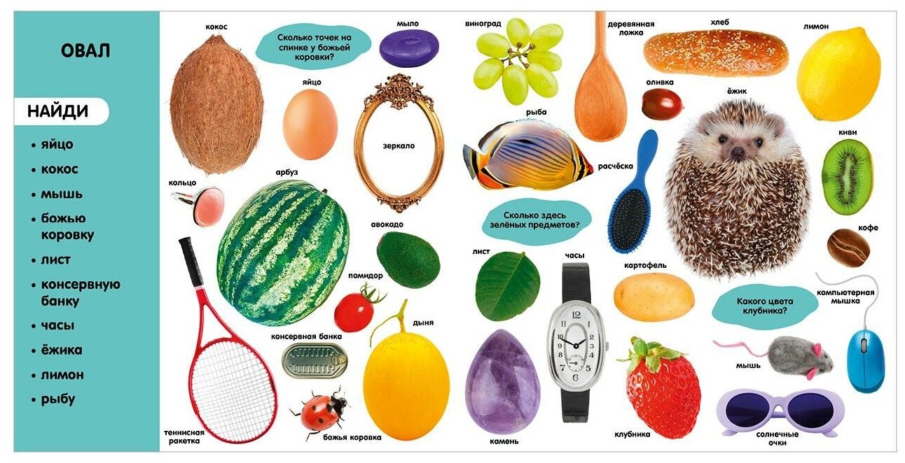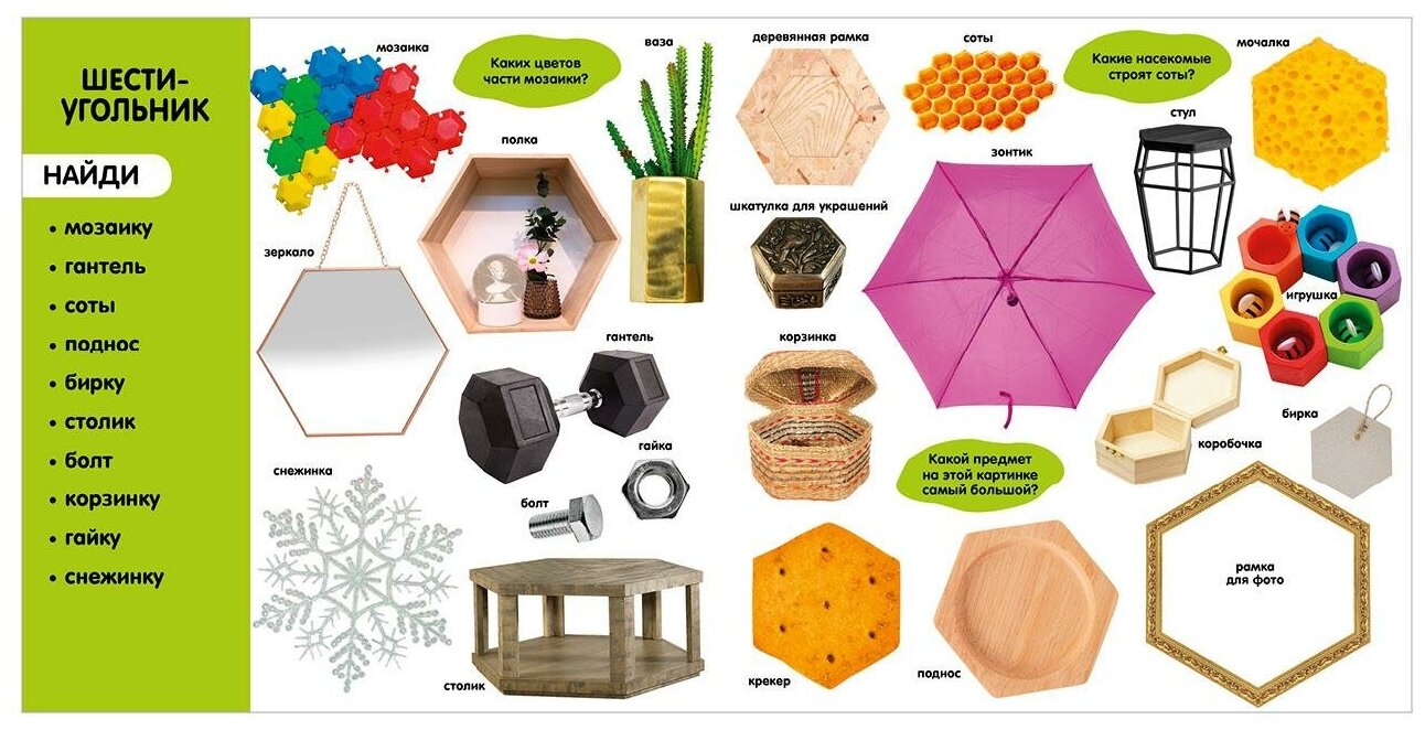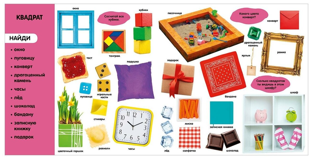 Почему работать с этой книжкой так интересно? На каждом развороте малыш будет знакомиться с новой формой, играть в «найди и покажи», отыскивая и считая заданные предметы, отвечать на вопросы. Кроме того, занятия с книгой помогут увеличить словарный запас, ведь названия всех предметов подписаны, а это целых 249 новых слов!