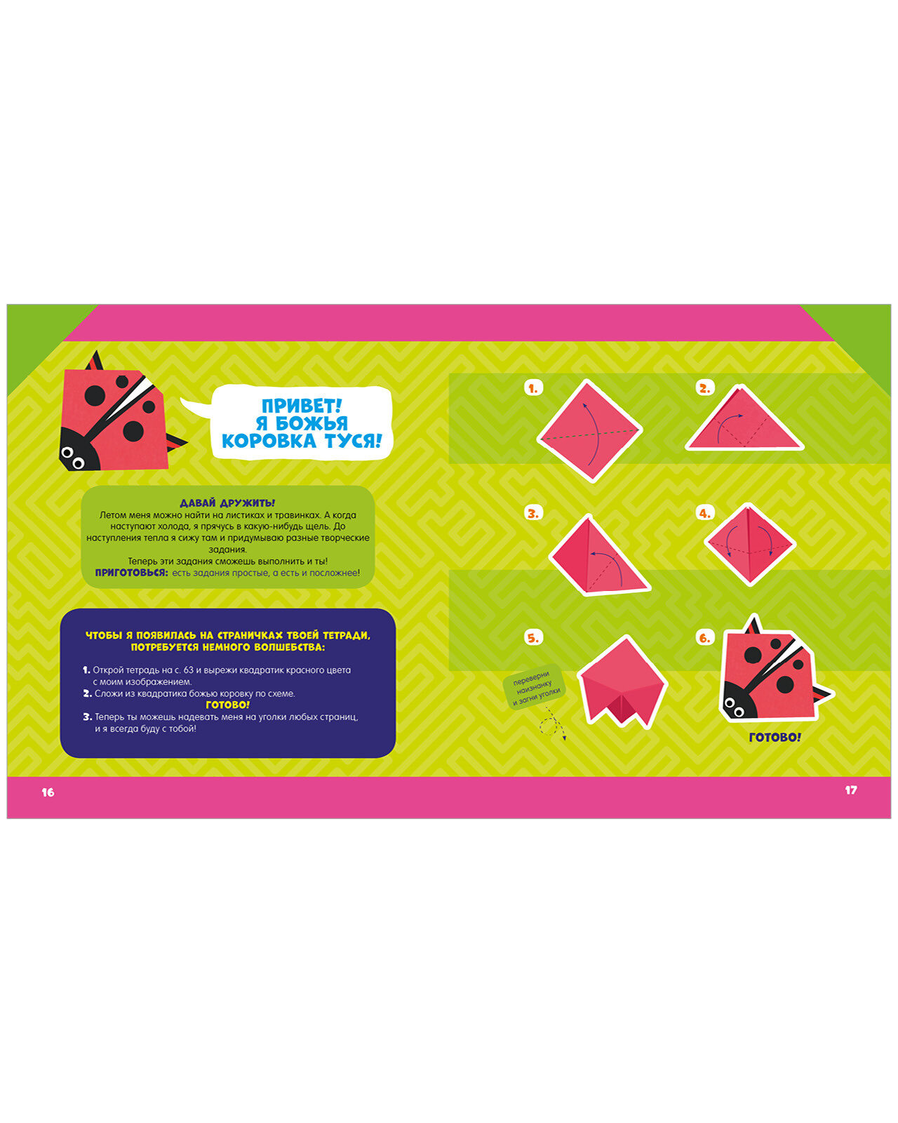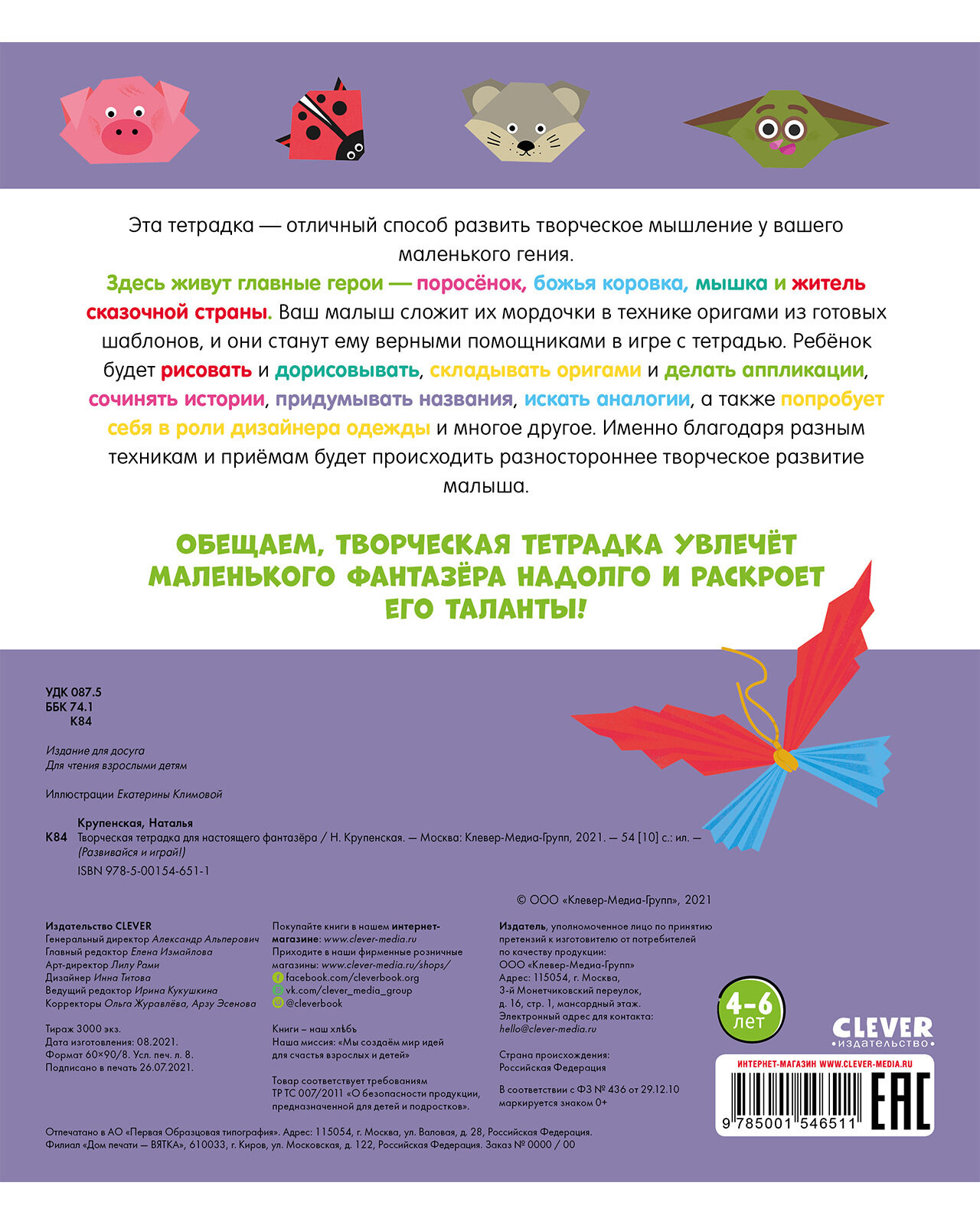 Эта тетрадка - отличный способ развить творческое мышление у вашего маленького гения. Здесь живут главные герои - поросёнок, божья коровка, мышка и житель сказочной страны. Ваш малыш сложит их мордочки в технике оригами из готовых шаблонов, и они станут ему верными помощниками в игре с тетрадью. Ребёнок будет рисовать и дорисовывать, складывать оригами и делать аппликации, сочинять истории, придумывать названия, искать аналогии, атакже попробует себя в роли дизайнера одежды и многое другое. Именно благодаря разным техникам и приёмам будет происходить разностороннее творческое развитие малыша. Обещаем, творческая тетрадка увлечёт маленького фантазёра надолго ираскроет его таланты!