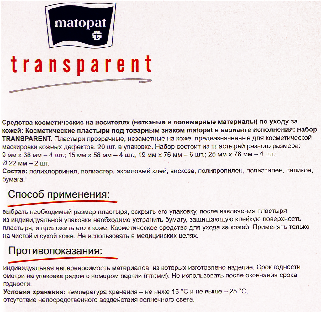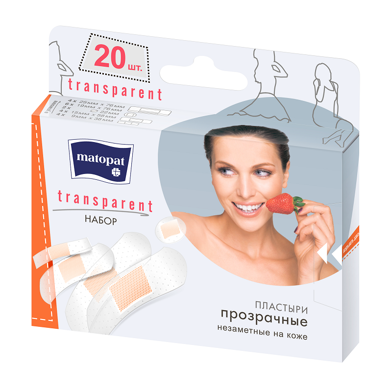 Бактерицидный пластырь Matopat Transporent – это пластырь из прозрачной пленки на полимерной основе, покрытый слоем гипоаллергенного клея, надежно фиксирующем его на любом, заданном участке тела.