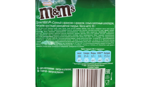 Восхитительно вкусный жареный арахис с солью, покрытый аппетитным молочным шоколадом и красочной хрустящей глазурью. - Немного арахиса + много вкуса = безудержное веселье. Берите на любой праздник пару пачек вкусного угощения M&M's с арахисом в молочном шоколаде! - Размер порции идеален для того, чтобы в полной мере насладиться отдыхом после долгого дня.- Пачка M&M’s идеально подойдет как для просмотра кино или сериала, так и для того, чтобы взять с собой в дорогу и не ждать весь день, а получить удовольствие даже от утренней поездки на работу. - Возьмите одну из упаковок в офис и порадуйте себя и коллег!- Попробуйте добавить M&M’s в ваши любимые десерты, чтобы удивить родных и близких или просто побаловать себя.1 х 80г драже с молочным шоколадом