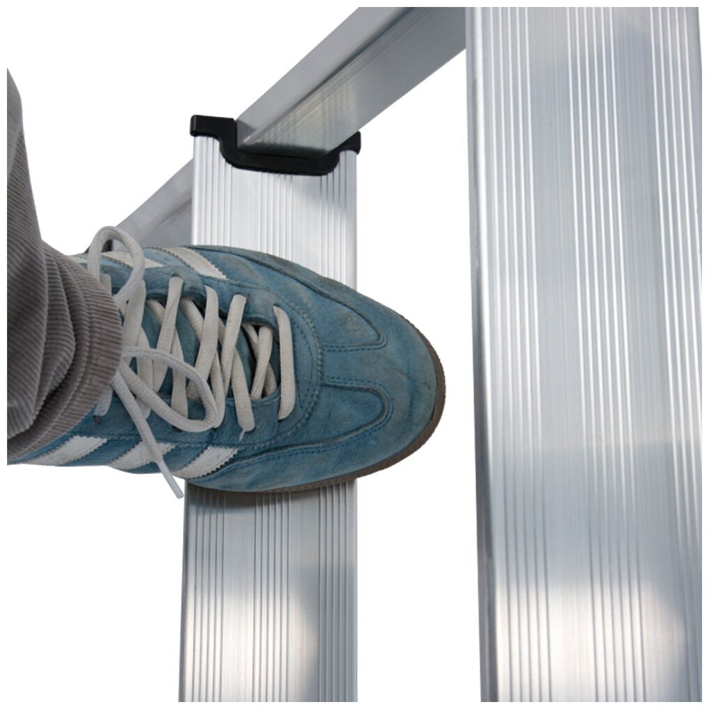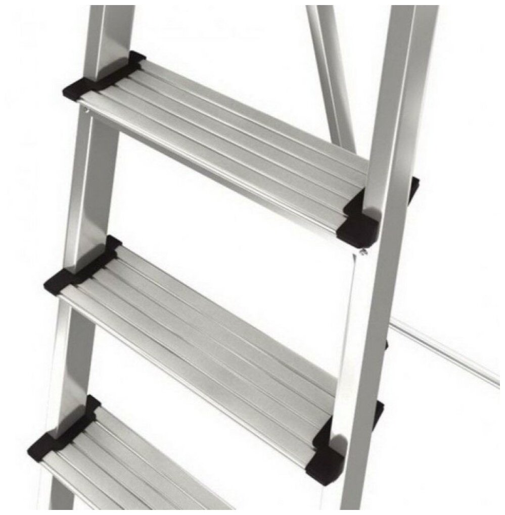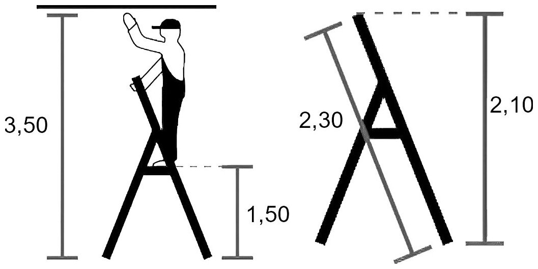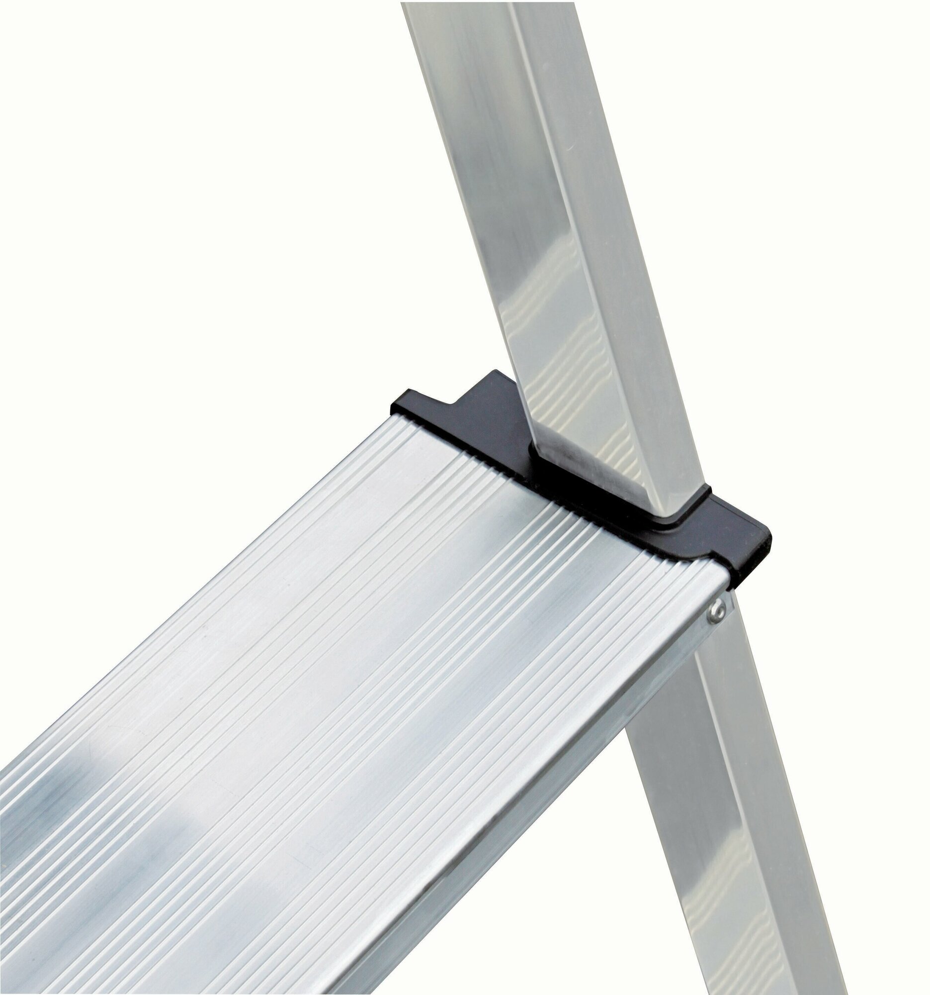 Стремянка оборудована профилированными ступенями, служащими для безопасного подъема и более удобного расположения при работе. Ширина ступеней составляет 80 мм. Шарнирное соединение опорной и основной частей. Боковины подъемной и опорной частей изготовлены из прямоугольной алюминиевой трубы. Надежность при работе обеспечивает высокая дуга безопасности.