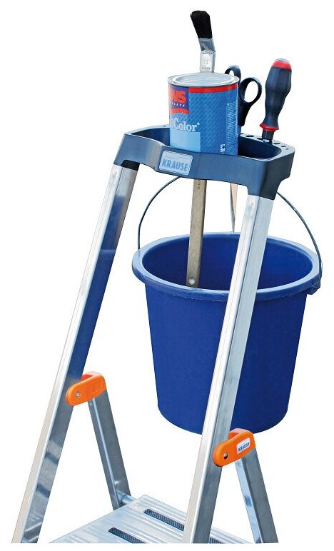 Свободностоящая стремянка Krause SAFETY 126351 применяется для проведения различных бытовых работ. Стремянка снабжена большой полкой для инструментов со специальными крюками для ведер. Безопасность при подъеме и удобство расположения при работе обеспечивают профилированные ступени шириной 80 мм.