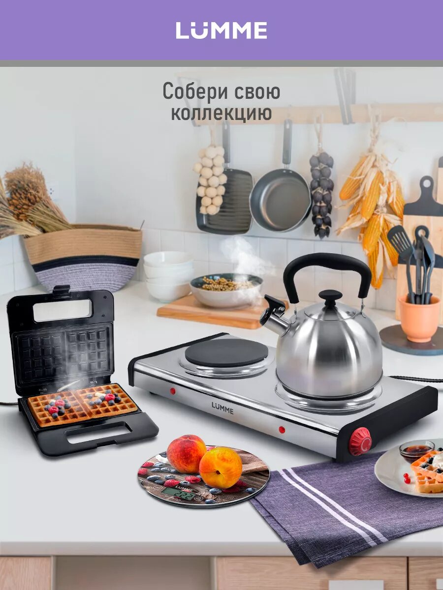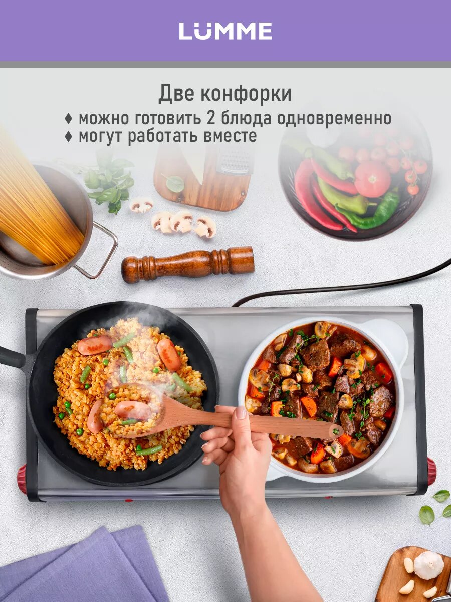 Электрическая настольная плита Lumme LU-3635 — это компактная модель мощностью 4000 Вт. Она оснащена двумя индукционными конфорками диаметром 260 мм каждая.