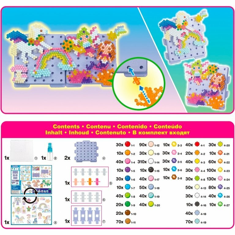 Познакомьтесь с миром творчества при помощи набора Aquabeads 31837 Зачарованный мир. Смотрите на подробную инструкцию, создавайте уникальные фигурки и наслаждайтесь творческим процессом. • Чтобы сделать игрушку из бусин, нужно выложить бусины на форму для бусин с шаблоном. • Бусины соединятся волшебным образом, если вы распылите на них воду с помощью распылителя. • Фигурки полностью высыхают за 60 минут. • Готовые фигурки можно поместить на форму-дисплей, которая станет прекрасным дополнением домашнего интерьера. • Игровой набор станет отличным подарком для детей в возрасте от 4 лет и старше. • Игрушка имеет много мелких деталей, поэтому не подойдет детям младше 3 лет. • С помощью листа шаблонов создавайте фигурки русалок, принцесс, троллей, пегаса, феи и других мистических существ. • Игровой набор отлично развивает мелкую моторику, воображение и фантазию.