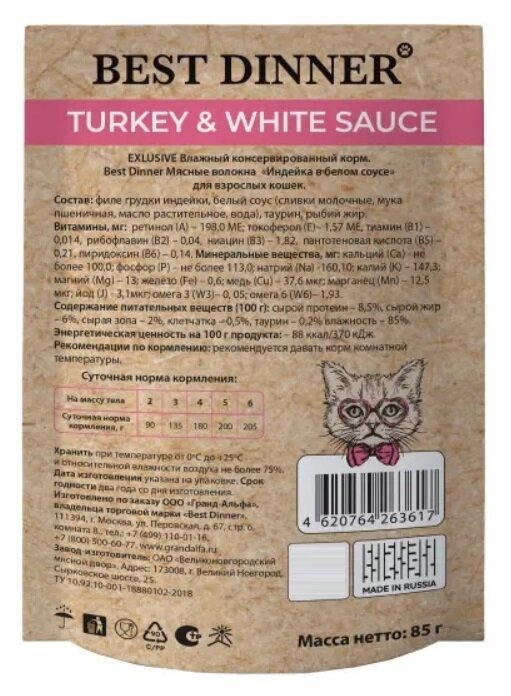 Влажный корм для кошек Best Dinner High Premium с индейкой в белом соусе 0085 кг
