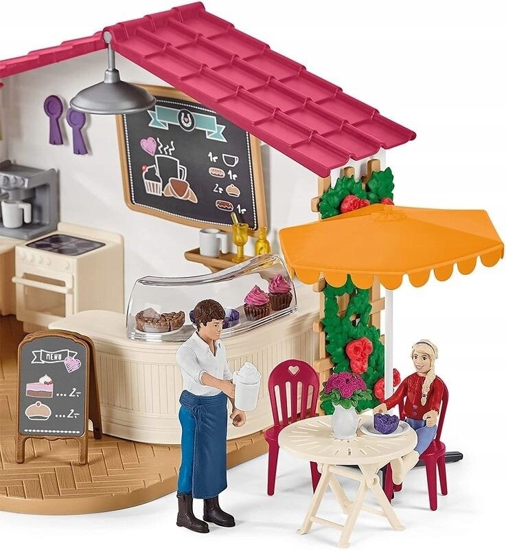 В составе набора: 1x меблированное кафе Rider, 1x мальчик (Том), 1x девушка (Клара), 2x лошади, 1x фартук официанта, 4x стула, 2x стол для бистро, 1x зонтик, 4x чашки, 4x тарелки, 2x стакана с трубочкой для питья, 4x черничный торт, 4 яблочного торта, 4 кексов, 2 взбитых сливок, 3 бутылки лимонада, 1 кормушка, 2 чемпионские ленты, 1 воротник на голову, 1 яблоко, 1 седло, уздечка и поводья, 2 вазы, 2 букета цветов, 1 розовая решетка с розами, 1 доска меню, 1 рекламный щит, 1 золотой ключик, 1 прилавок, 1 витрина, 1 духовка, 1 полка, 1 кофеварка, 1 касса, 1 потолочная лампа, 1 х шест для привязи лошадей, 1 стойка для сена, 1 корыто, 1x кормушка, 1x повозка со сбруей, 1x брюшной ремень, 1x уздечка, 1x поводья, 6 декоративных подков, 6 декоративных листьев клевера, 6 декоративных бабочек, 1x собака (Рубин), 1x стик, 1x наклейка, 1x инструкция по сборке.