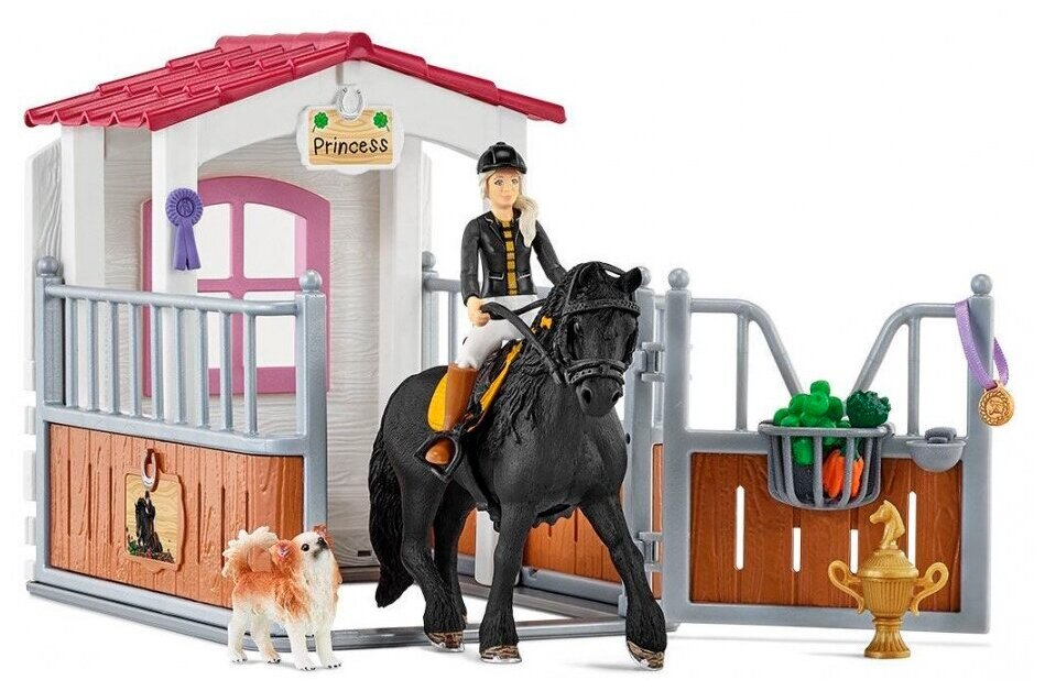 | Состав набора | Конюшня, Фигурка Тори, Фигурка Фризской кобылы, Фигурка Чихуахуа, Седло, Уздечка и поводья, Кормушка, Поилка, Морковка, Кубок, Золотая медаль 2 шт., Лента победителя, Шлем |
