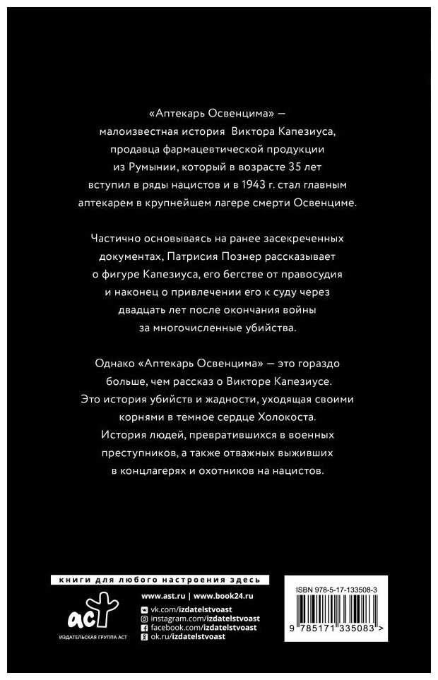 "Аптекарь Освенцима" — малоизвестная история Виктора Капезиуса, продавца фармацевтической продукции из Румынии, который в возрасте 35 лет вступил в ряды нацистов и в 1943 г. стал главным аптекарем в крупнейшемлагере смерти Освенциме.Частично основываясь на ранее засекреченных документах, Патрисия Познер рассказывает о личности Капезиуса, его бегстве от правосудия и наконец о привлечении его к суду через двадцать лет после окончания войны за многочисленные убийства.Однако "Аптекарь Освенцима" — это гораздо больше, чем рассказ о Викторе Капезиусе. Это история убийств и жадности, уходящая своими корнями в темное сердце Холокоста. История людей, превратившихся в военныхпреступников, а также отважных выживших в концлагерях и охотников на нацистов.