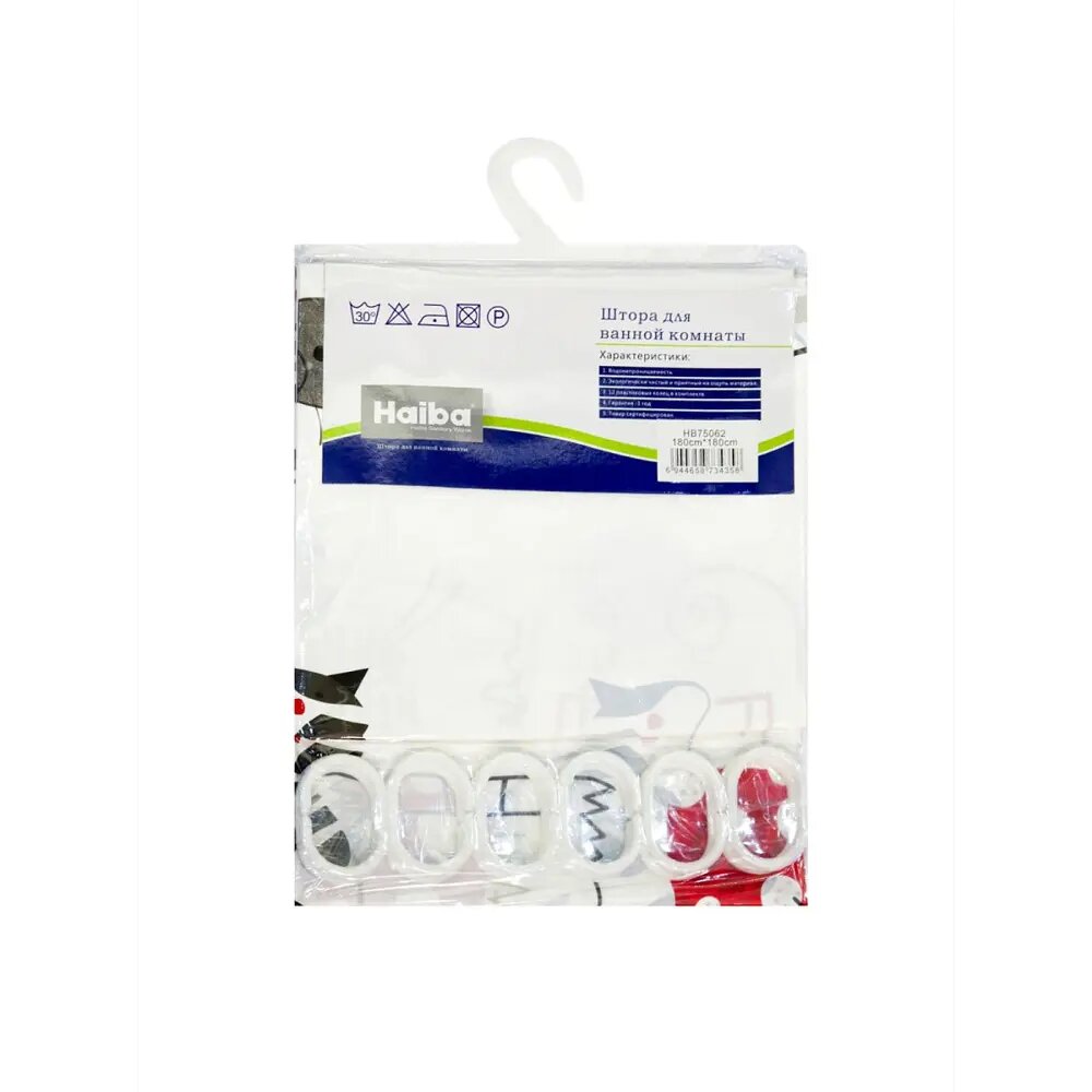 Занавеска для ванны Haiba HB75062, белый. Штора, кольца. Исполнена из высококачественного полиэстера - экологически чистый и приятный на ощупь материал. В комплект входят 12 колец из пластика.