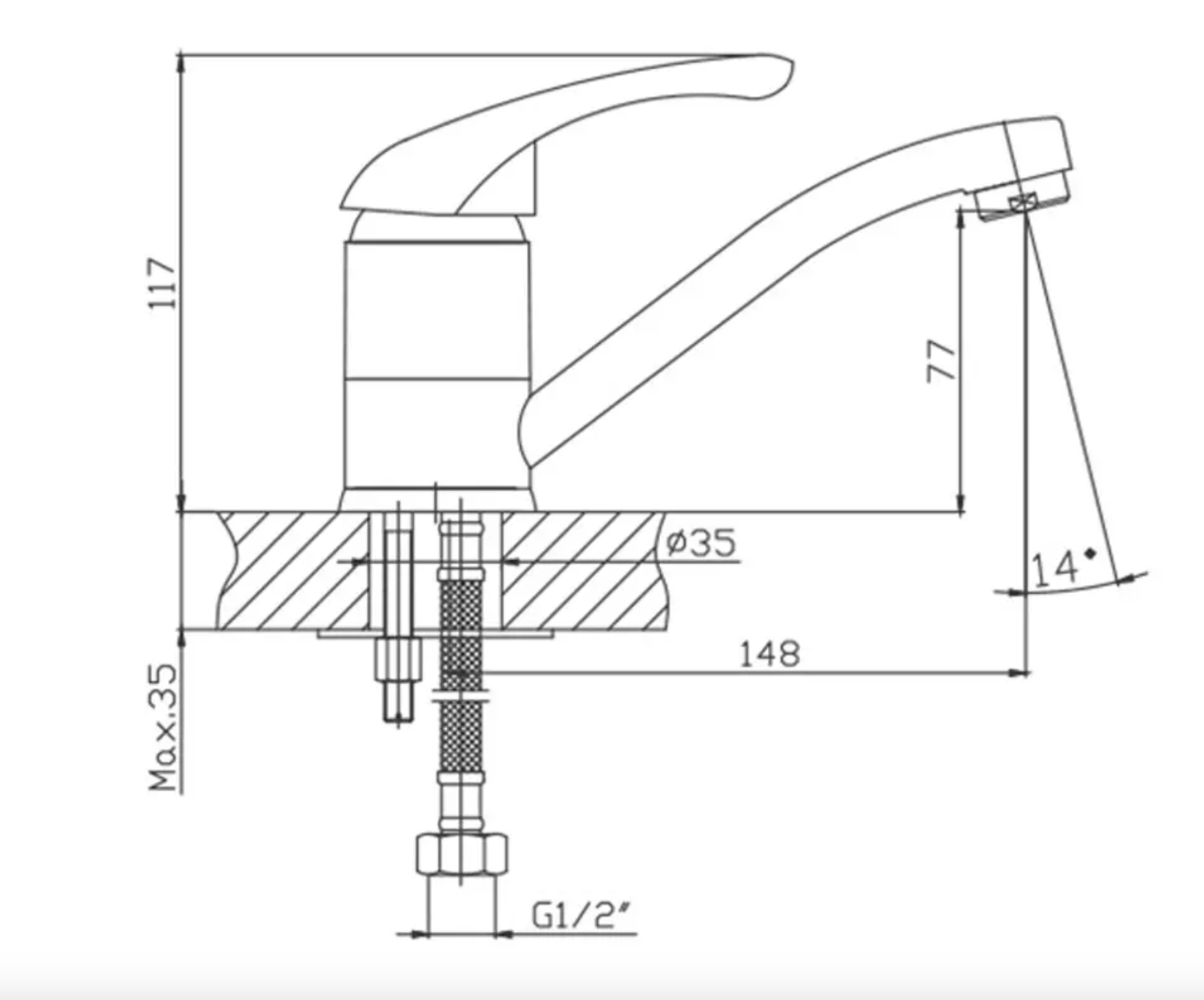 Керамический картридж 40 мм. Изготовлен из металлического сплава. Изменение угла аэратора на 14 градусов. Максимальная глубина монтажа 35 мм. Монтажное отверстие 35 мм. Поворотный излив. Цвет хром.