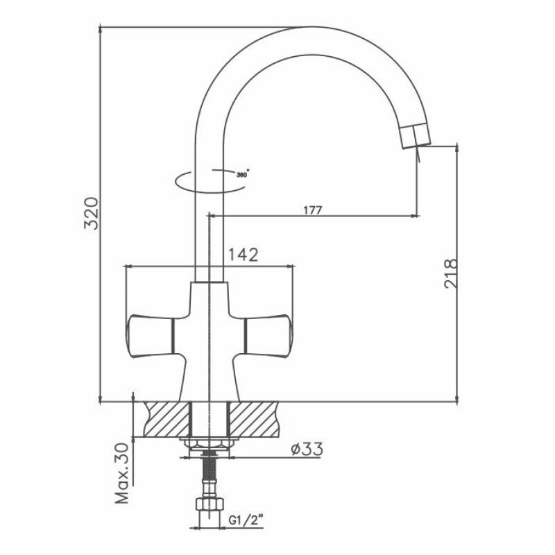 Вентильное управление. Изготовлен из металлического сплава. Максимальная глубина монтажа 30 мм. Монтажное отверстие 33 мм. Поворотный излив. Цвет хром.