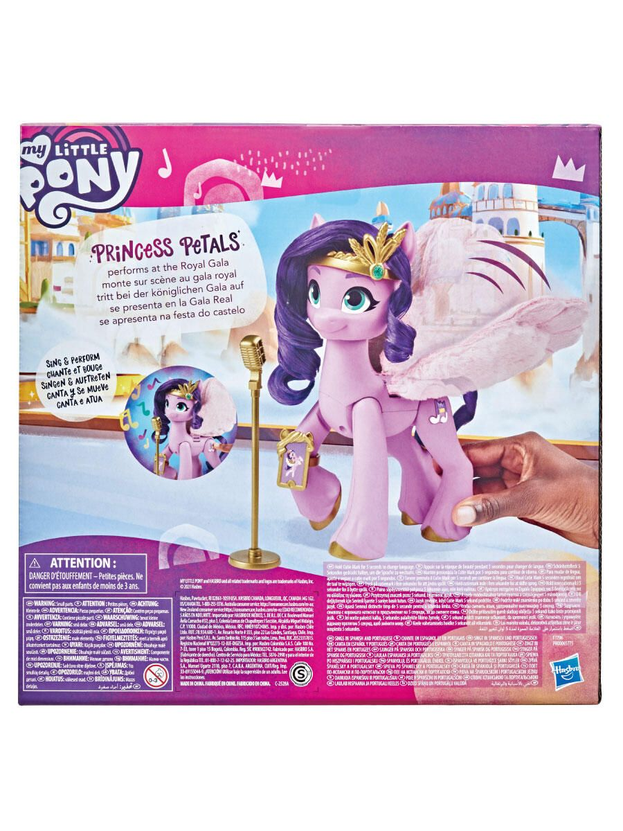 Знакомьтесь с Принцессой Петалс, пегасом с Зефирных Гор! Она стильная и невероятно талантливая поп-звезда. С этой фигуркой, вдохновленной фильмом “My Little Pony: Новое поколение”, можно разыграть грандиозное выступление на Королевском Гала-концерте!