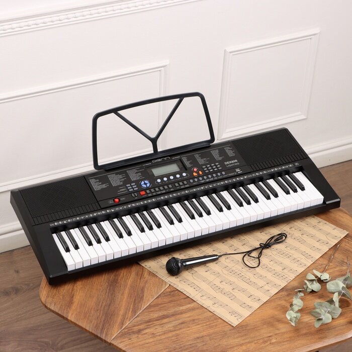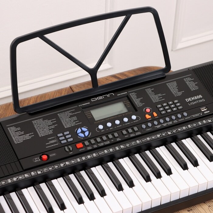 Синтезатор Denn оснащен подставкой для нотных тетрадей. На специальном экране отображаются уровень громкости и выбранные функции. Корпус модели произведен из прочного пластика. Износостойкий материал не подвержен сколам, трещинам, деформации. Устройство надолго сохраняет первоначальный внешний вид и потребительские свойства. При необходимости поверхность синтезатора можно очищать сухой салфеткой.