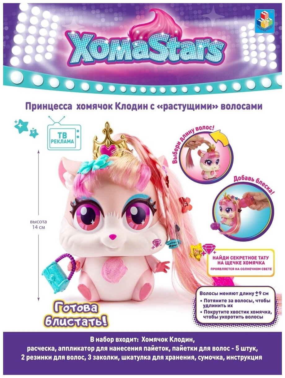 Стильный питомец-хомячок Клодин из серии ХомаStars с "растущими" волосами. У каждого хомячка своё эксклюзивное средство для создания ультрамодной прически: блестящий гель или пайетки или мелки. Длина волос меняется! Потяни за волосы, чтобы увеличить длину, покрути хвостик, чтобы укоротить длину! А еще на щечке хомячка есть секретное тату, ты найдешь его при помощи солнечных лучей или УФ фонарика (в комплект не входит). Она милая и нежная, у нее душа принцессы. Клодин любит все мягкое и пушистое. Клодин верит в волшебство и любовь с первого взгляда. Ее любимая заколка - тиара с большим сердцем, как у нее самой. Она обожает играть на саксофоне.