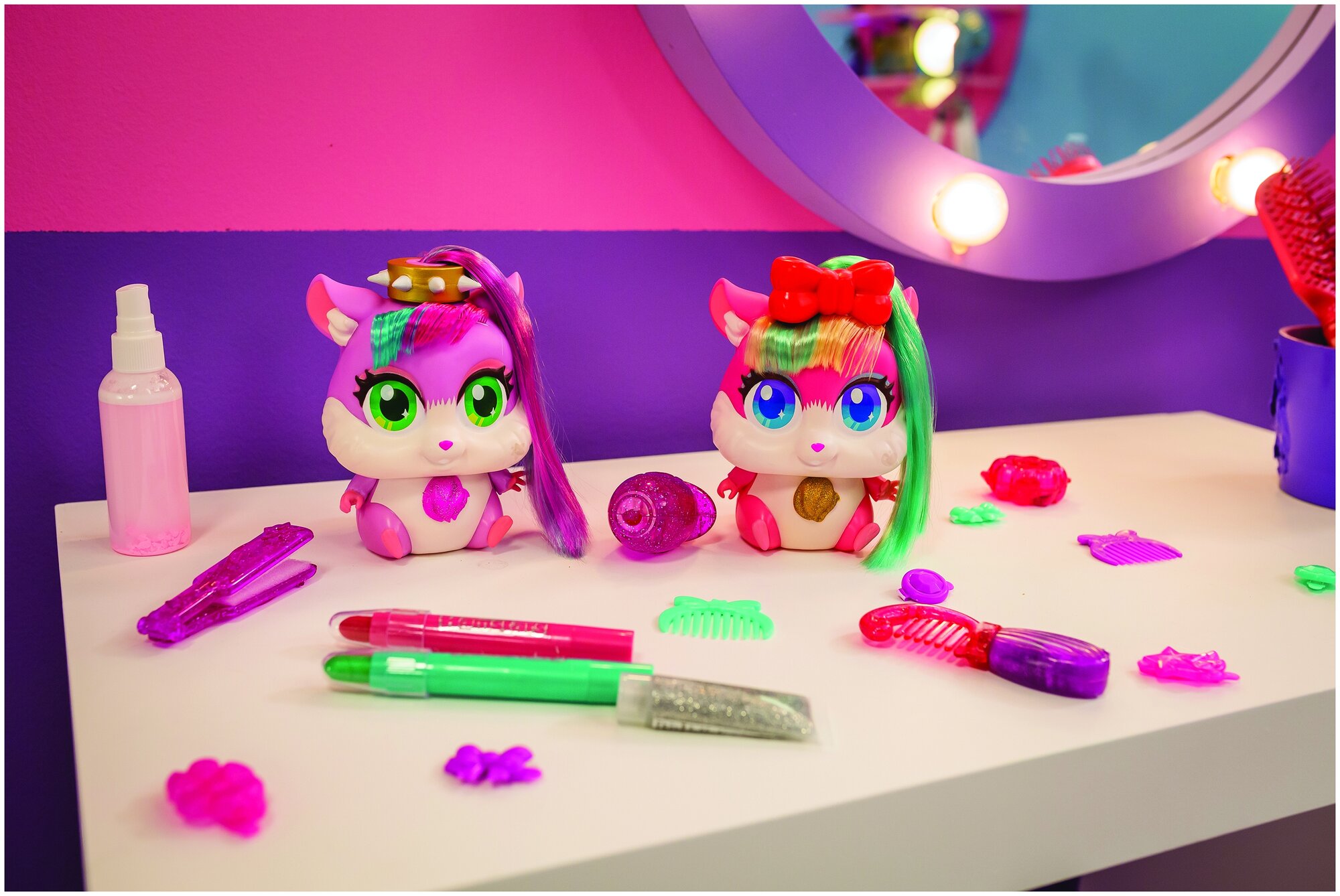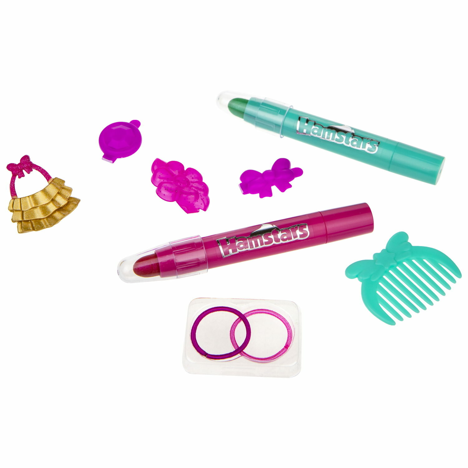 В комплект входят: стильный хомячок, расческа, утюжок для нанесения блеска, тюбик с блеском, 2 резинки для волос, 3 заколки, сумочка, инструкция.
