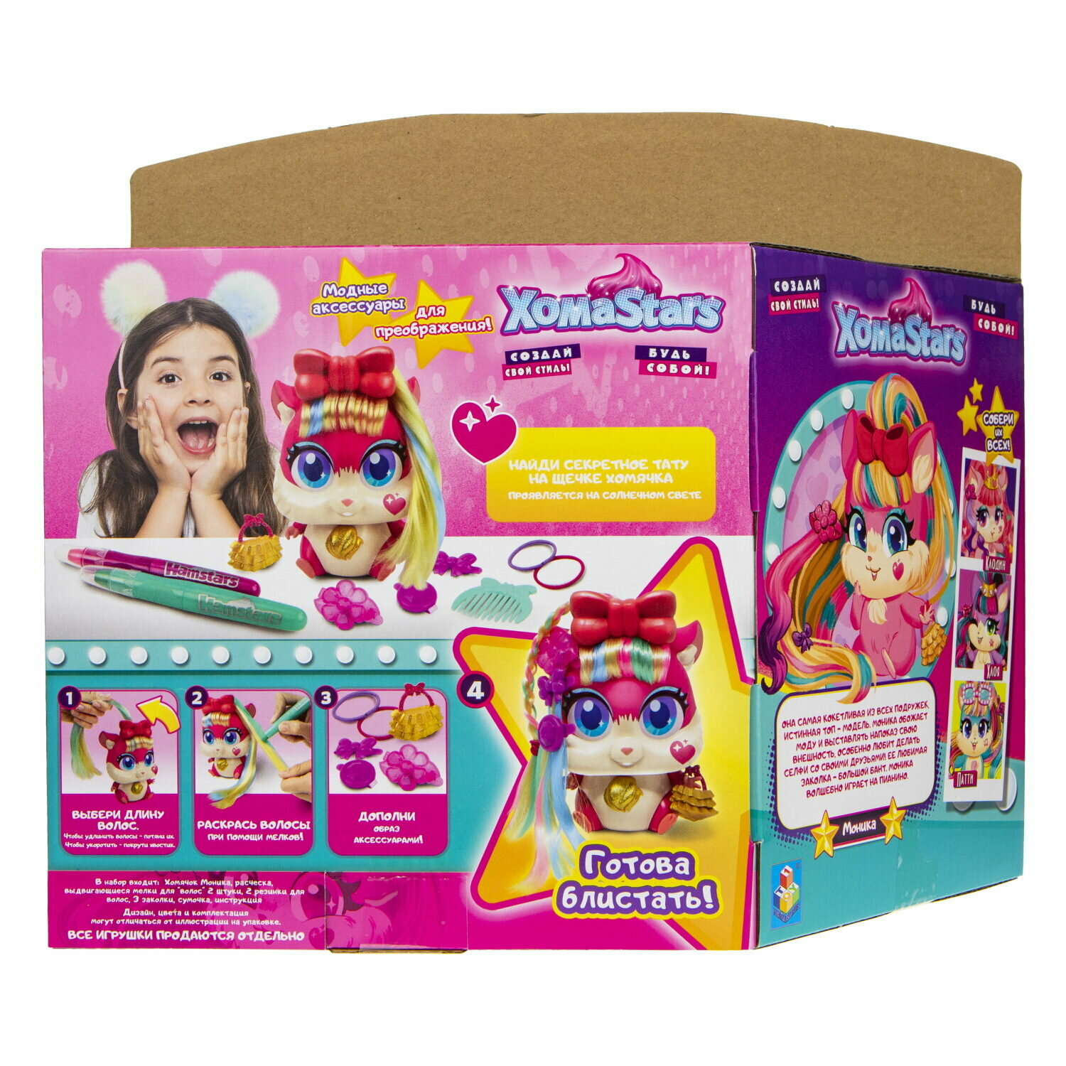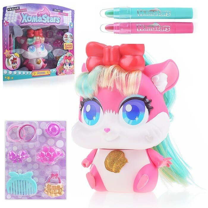 | Комплектация | стильный хомячок, расческа, мелки для волос 2 шт., резинки для волос 2 шт., заколки 3 шт., сумочка, инструкция |