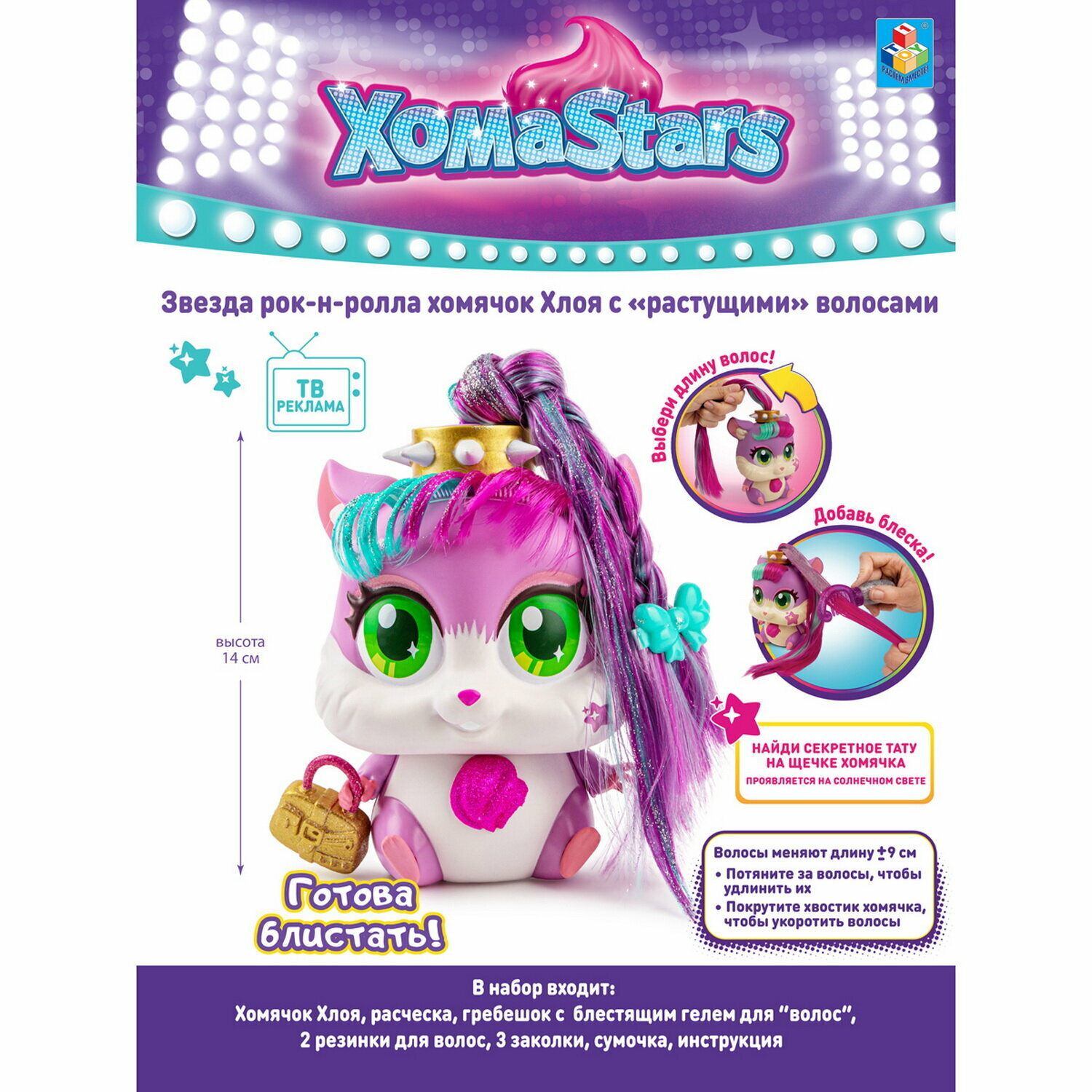 Стильный питомец-хомячок Хлоя из серии ХомаStars с "растущими" волосами. У каждого хомячка своё эксклюзивное средство для создания ультрамодной прически: блестящий гель или пайетки или мелки. Длина волос меняется! Потяни за волосы, чтобы увеличить длину, покрути хвостик, чтобы укоротить длину! А еще на щечке хомячка есть секретное тату, ты найдешь его при помощи солнечных лучей или УФ фонарика (в комплект не входит). Немного сумасшедшая, смелая, с рокерской душой. Хлоя любит играть на ударных, а также яркие разноцветные вещи и неоновые огни. Ее любимый аксессуар - металлическая заколка с шипами в истинно рокерском стиле! Она любит экспериментировать с цветом волос.
