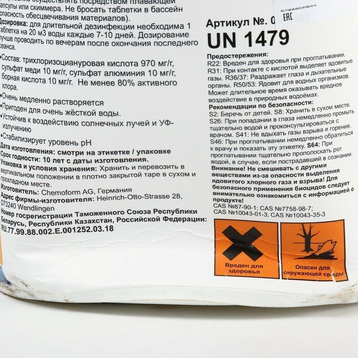 Хлорные таблетки для длительной дезинфекции, флокуляции и уничтожения водорослей в бассейне. Приготовленно с использованием трихлоризоциануровой кислоты, около 80% активного хлора.