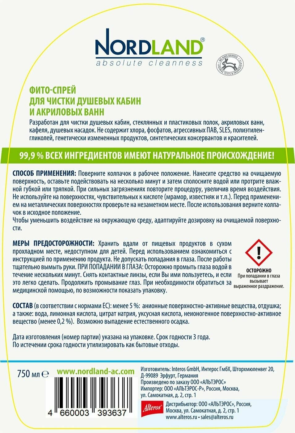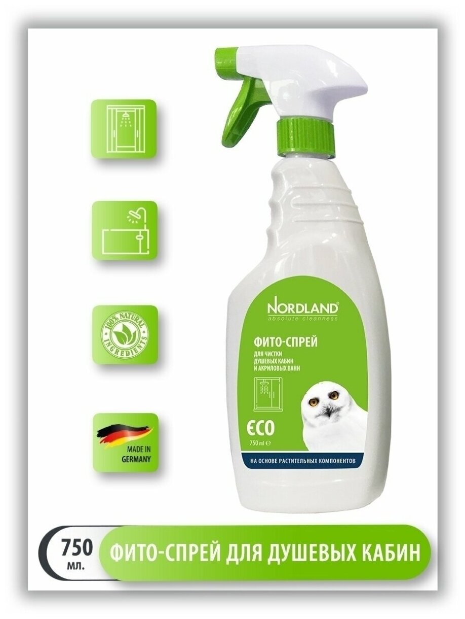 Фито-спрей Nordland разработан для чистки душевых кабин, стеклянных и пластиковых полок, акриловых ванн, кафеля, душевых насадок. Не содержит хлора, фосфатов, агрессивных ПАВ, SLES, полиэтиленгликолей, генетически измененных продуктов, синтетических консервантов и красителей.