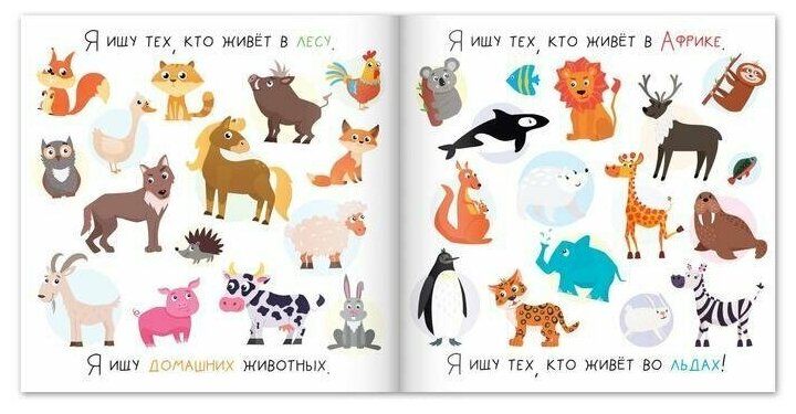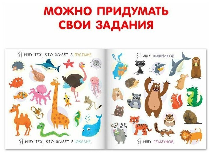 Очень хорошая книжечка. Путешествует с нами по миру уже не первый месяц!) Она маленькая, лёгкая, зато содержание ее такое универсальное, что можно долго заниматься с ребенком. Помогла нам и в самолёте, и в машине в долгих поездках! Внутри несколько разворотов с изображениями разных животных, на каждой странице свое задание. Например, найти всех рогатых животных, или всех животных, живущих в Африке. Но ведь родители могут и сами придумать дополнительные вопросы к картинкам! Сами рисунки милейшие, особенно котики) бумага мелованная.