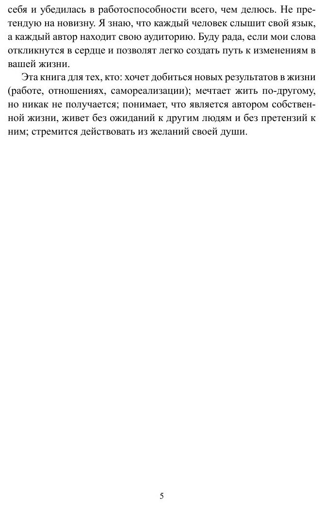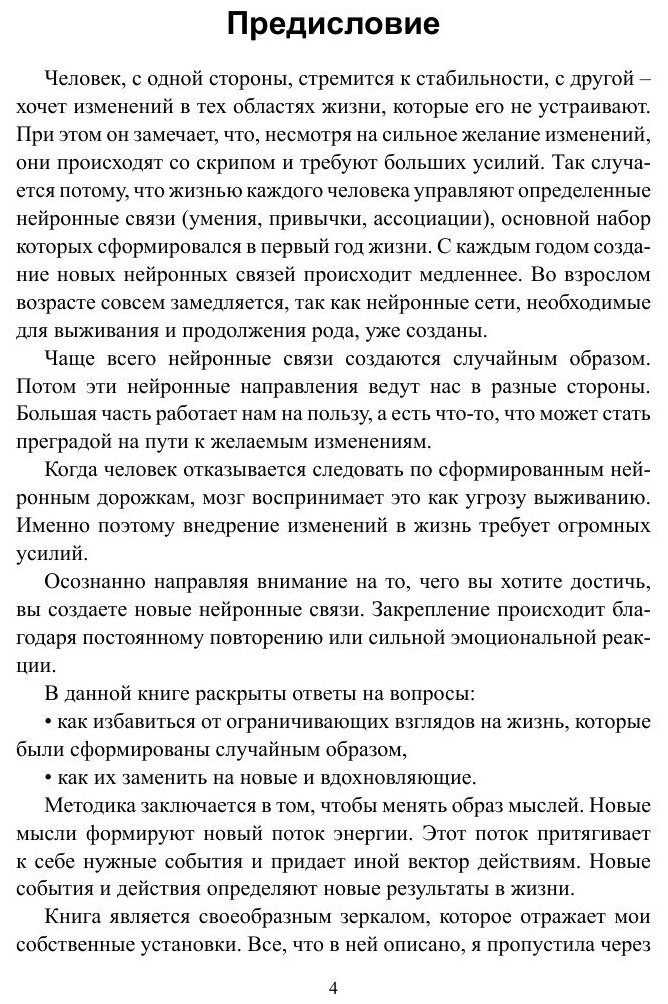 Начала читать эту книгу потому, что очень хотела поменять свою жизнь кардинально. Не складывались отношения, постоянно на работе были какие то непростые ситуации, не доводила до конца дела и постоянно откладывала какие то планы. Слушала медитации, читала много книг по психологии, слушала Зеланда, и тут случайно увидела эту книгу. Для меня она стала волшебной палочкой. Каждый день прорабатываю свои установки, трансформирую свое мышления и уже вижу, как меняется ситуация. Поняла, что необходимо в первую очередь работать над своим мышлением и тогда все, что казалось невозможным, оказывается простым в реализации.