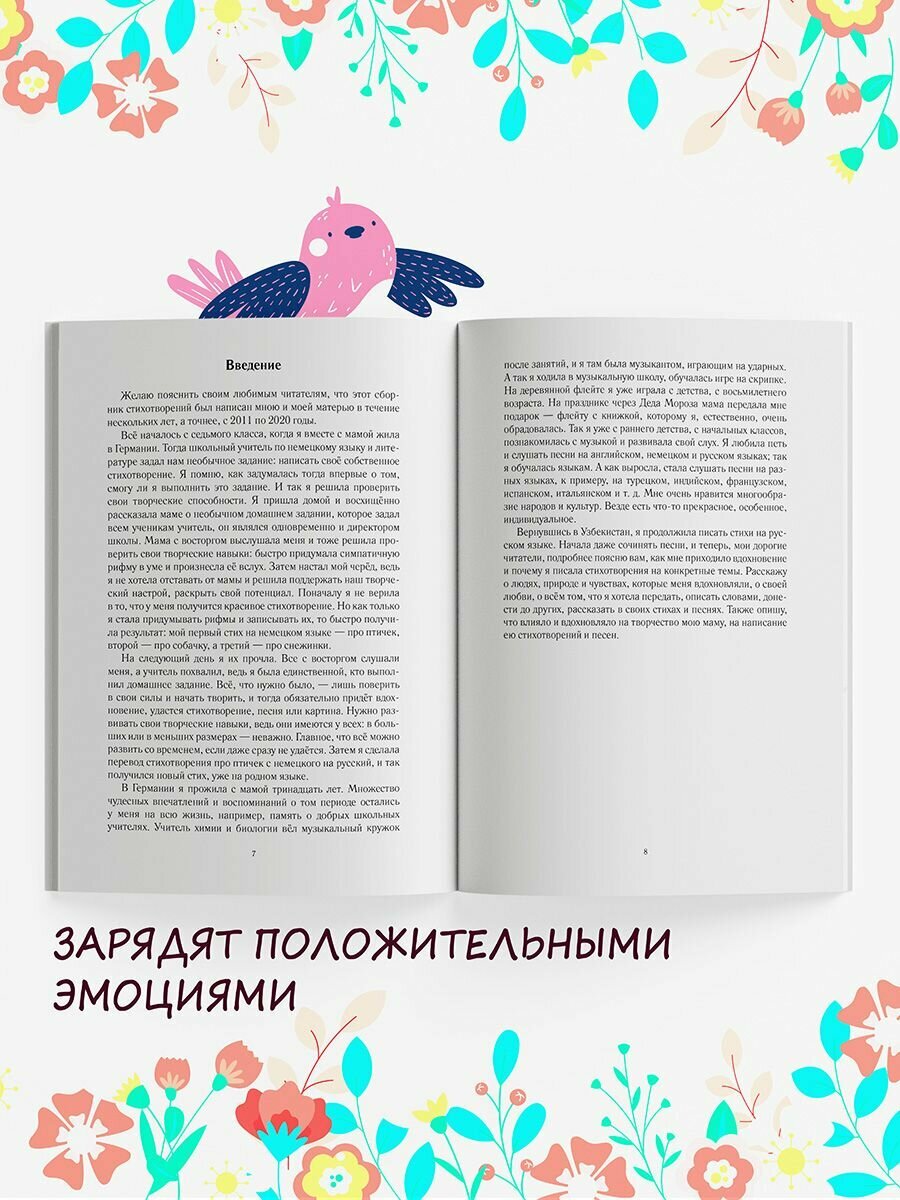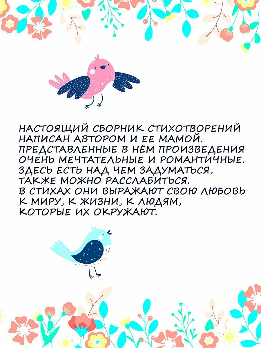 Настоящий сборник стихотворений написан мною и моей мамой. Представленные в нём произведения очень мечтательные и романтичные. Здесь есть над чем задуматься, также можно расслабиться. В стихах мы выражаем свою любовь к миру, к жизни, к людям, которые нас окружают.
