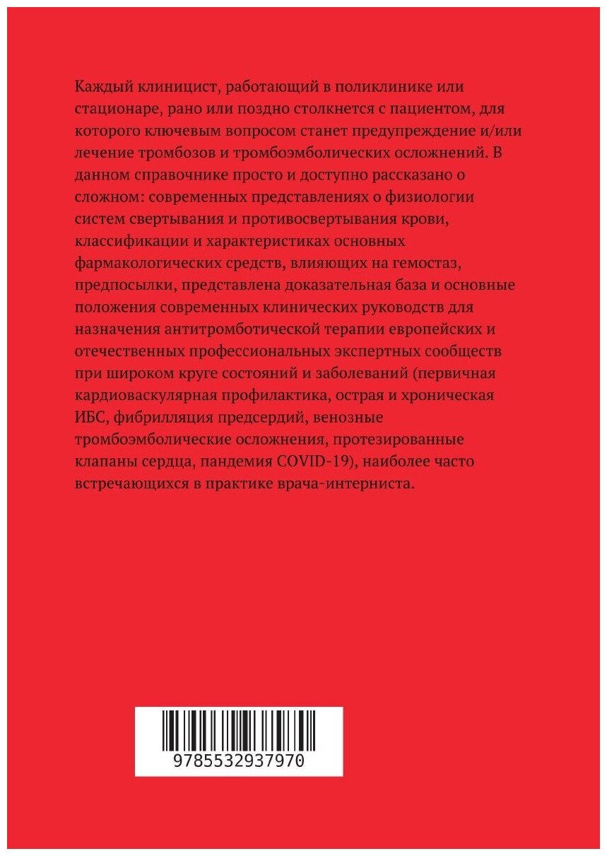 Каждый клиницист, работающий в поликлинике или стационаре, рано или поздно столкнется с пациентом, для которого ключевым вопросом станет предупреждение и/или лечение тромбозов и тромбоэмболических осложнений. В данном справочнике просто и доступно рассказано о сложном: современных представлениях о физиологии систем свертывания и противосвертывания крови, классификации и характеристиках основных фармакологических средств, влияющих на гемостаз, предпосылки, представлена доказательная база и основные положения современных клинических руководств для назначения антитромботической терапии европейских и отечественных профессиональных экспертных сообществ при широком круге состояний и заболеваний (первичная кардиоваскулярная профилактика, острая и хроническая ИБС, фибрилляция предсердий, венозные тромбоэмболические осложнения, протезированные клапаны сердца, пандемия COVID-19), наиболее часто встречающихся в практике врача-интерниста.