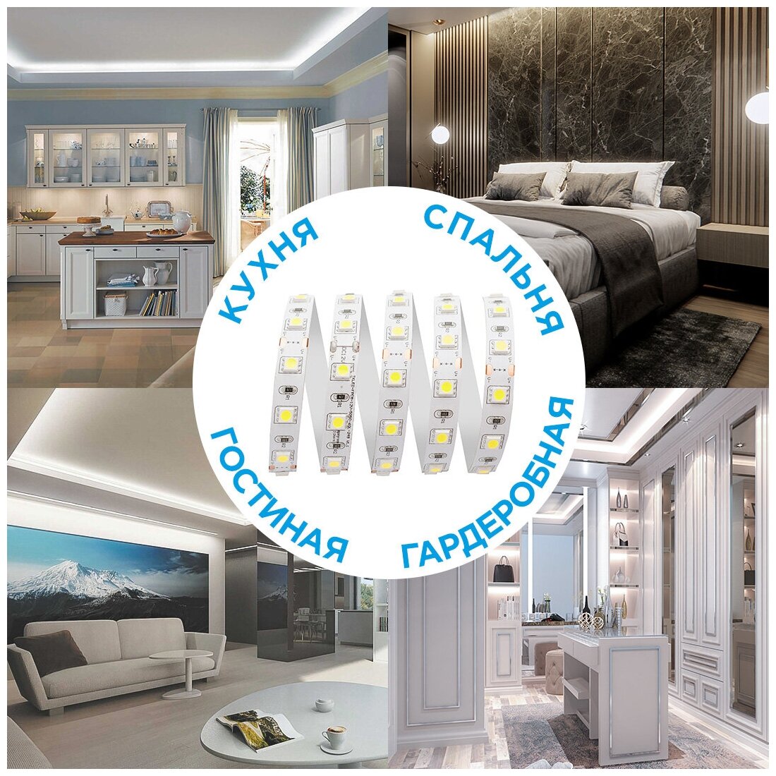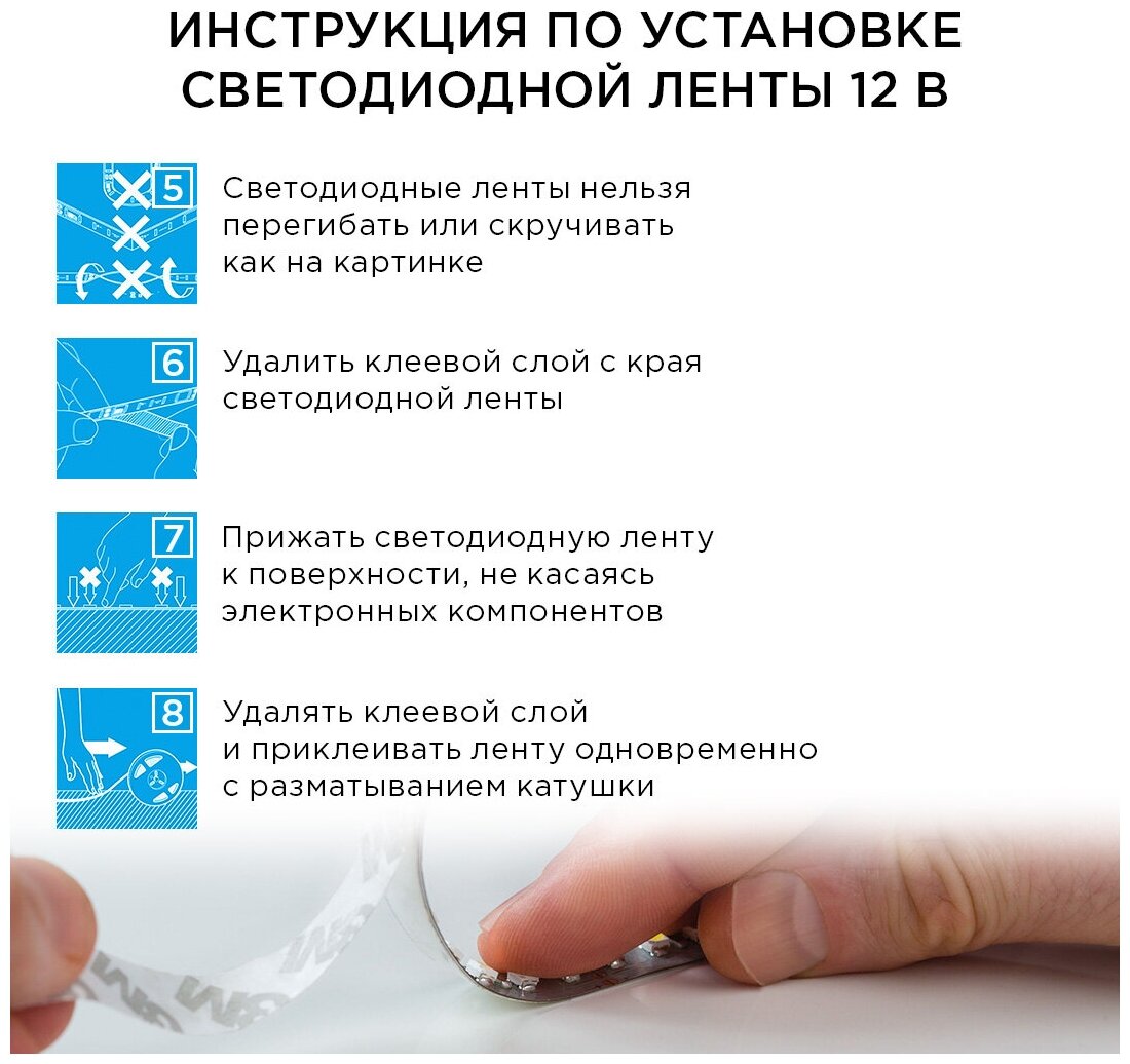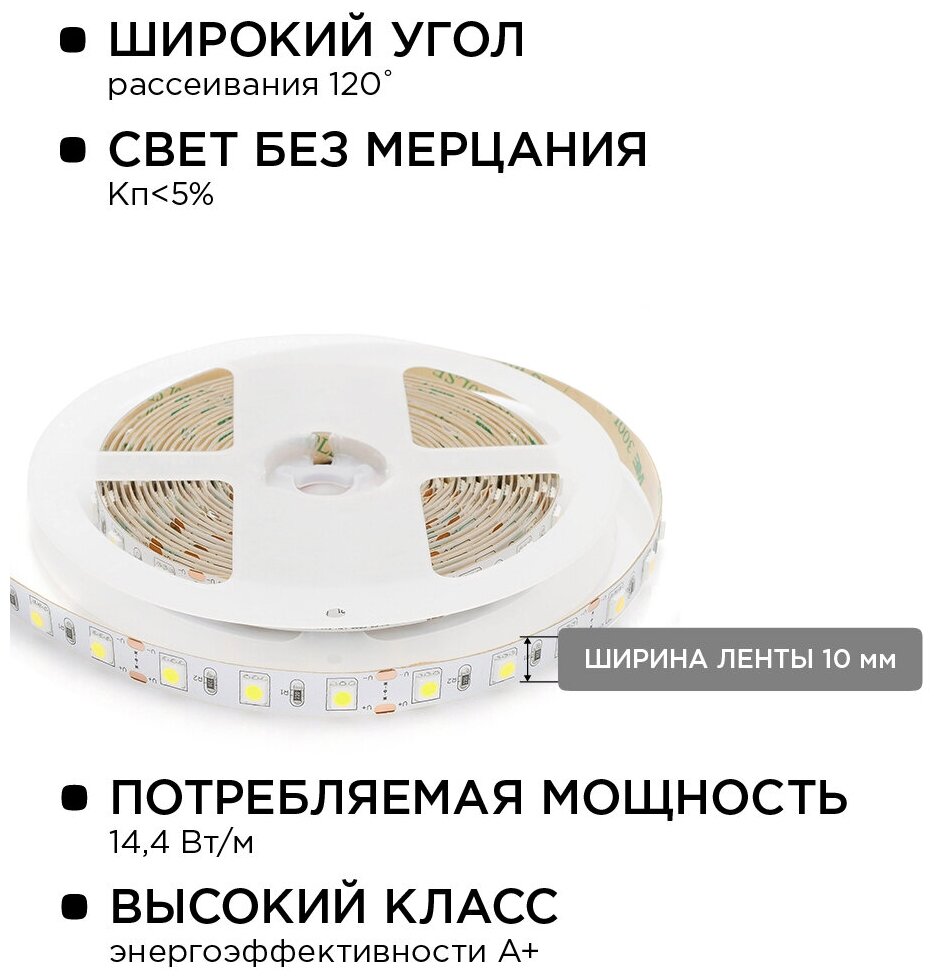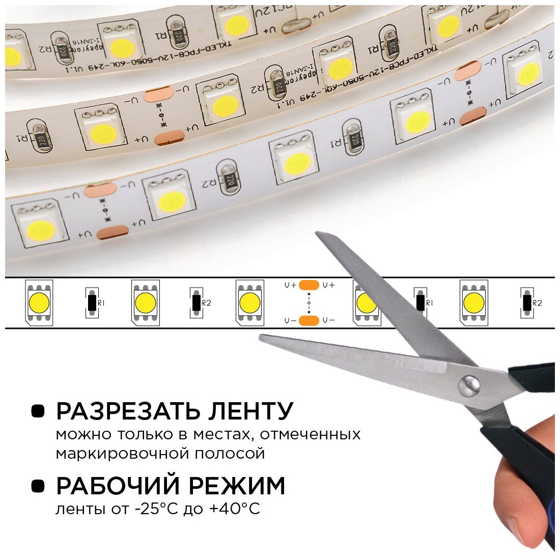 В состав готового комплекта светодиодной ленты входит 5 метров светодиодной ленты, которая работает от постоянного тока с напряжением 12В. Благодаря светодиодам smd 5050 излучающим световой поток равный 700 лм/м лента является прекрасным решением для воплощения в жизнь такого элемента декора, как декоративная подсветка. Она подойдет для декорирования ниш в стенах, многоуровневых потолков и даже мебели. По сравнению с лампами накаливания светодиодная подсветка эквивалентна лампам мощностью 70 Вт. Диодная лента обладает холодным белым цветом свечения с цветовой температурой 6500 К. Также в состав комплекта входит адаптер питания с проводом и вилкой в розетку с одной стороны и провод с выключателем и коннектором стандарта 5,5х2,5 для подключения светодиодной ленты, с другой стороны. Степень защиты такого адаптера соответствует стандарту IP44 и допускает установку во влажных местах, но в то же время должна сохраниться защита от прямого попадания воды. Степень защиты LED-ленты соответствует стандарту IP20. Отрезать светодиодную ленту можно в специально отмеченных местах, которые располагаются через каждые 100 мм. Компактные размеры светодиодной ленты с шириной 10 мм и основанием из гибкой, двухслойной, медной подложки дают огромное преимущество при создании любых дизайнерских фантазий.Ленту ищут также как: светодиодная лента белая, лента 12 В, лента светодиодная, диодная лента, неоновая лента, светодиодная подсветка, подсветка для комнаты, комплект ленты, led подсветка, лента светодиодная неоновая, светодиодная лента 5 метров.Преимущества:- Включи и пользуйся! В комплекте есть все, для того, чтобы осуществить монтаж без дополнительных затрат;- Идеальное решения для декорации здесь и сейчас в жилых помещениях;- Высококачественные светодиоды San’an;- Улучшенное охлаждение благодаря двухслойной медной подложке;- Срок службы не менее 50 000 часов;- Коннекторы и провода для подключения уже напаяны на светодиодную ленту;- Простота монтажа благодаря качественному 3М скотчу;- Экономия электроэнергии по сравнению с традиционными источниками свечения;- Комфортная цветопередача благодаря CRI>80.