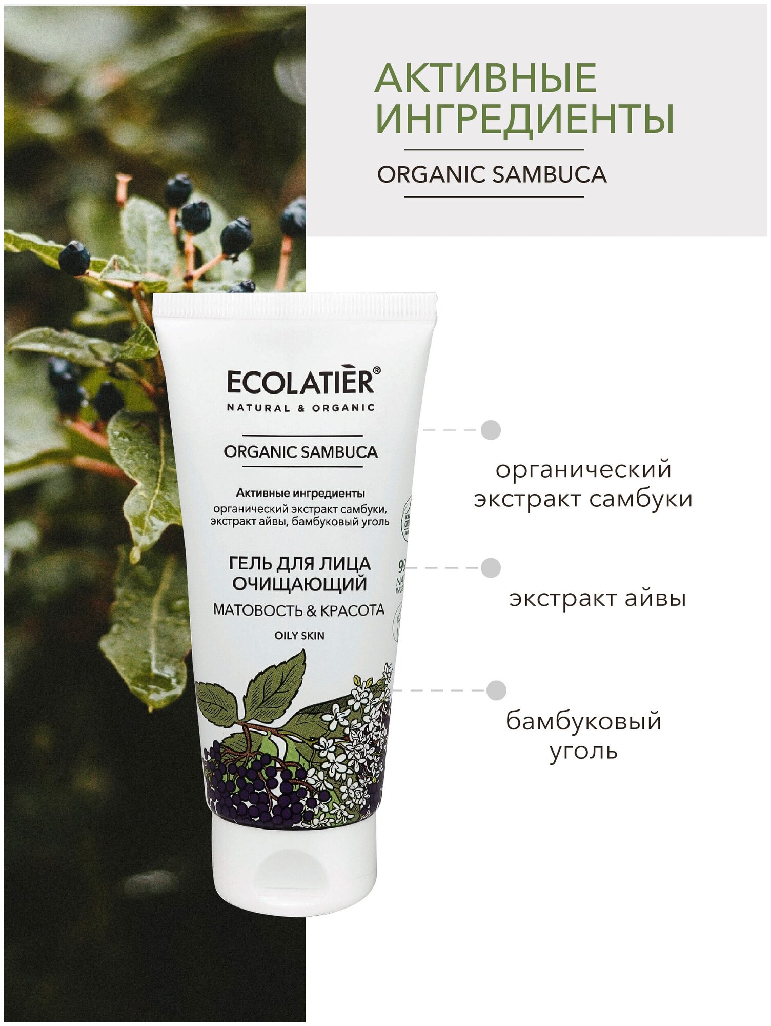 Гель для лица ECOLATIER® ORGANIC Sambuca эффективно очищает, убирает излишки себума с проблемной и склонной к жирности кожи, сужает поры.