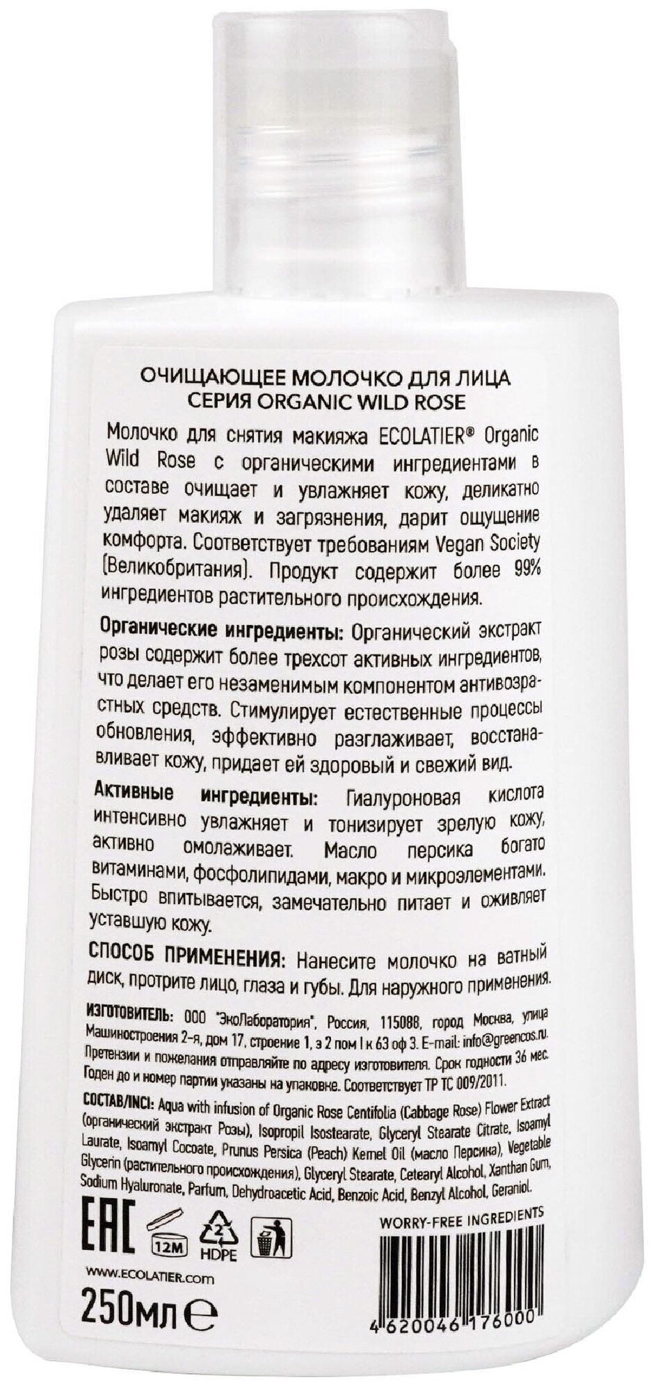 Молочко для снятия макияжа ECOLAТIER® Огgапiс Wild Rose с органическими ингредиентами в составе очищает и увлажняет кожу, деликатно удаляет макияж и загрязнения, дарит ощущение комфорта. Соответствует требованиям Vegan Society (Великобритания). Продукт содержит более 99% ингредиентов растительного происхождения.
