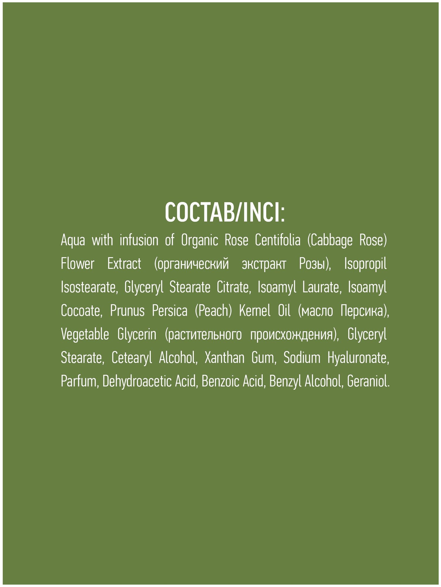 | Состав | aqua with infusion of organic rose centifolia (cabbage rose) flower extract (органический экстракт розы), isopropil isostearate, glyceryl stearate citrate, isoamyl laurate, isoamyl cocoate, prunus persica (peach) kernel oil (масло персика), vegetable glycerin (растительного происхождения), glyceryl stearate, cetearyl alcohol, xanthan gum, sodium hyaluronate, parfum, dehydroacetic acid, benzoic acid, benzyl alcohol, geraniol. |