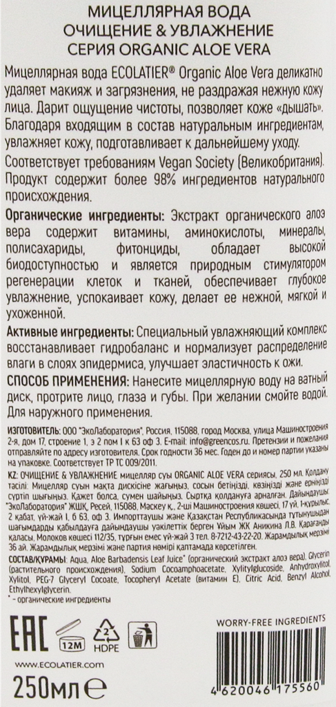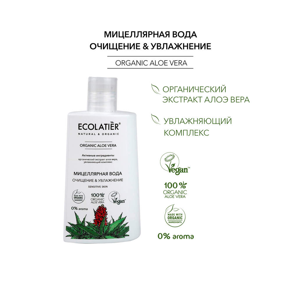 Мицеллярная вода ECOLATIER Organic Aloe Vera 250мл EСОLATIER (П099-37050)