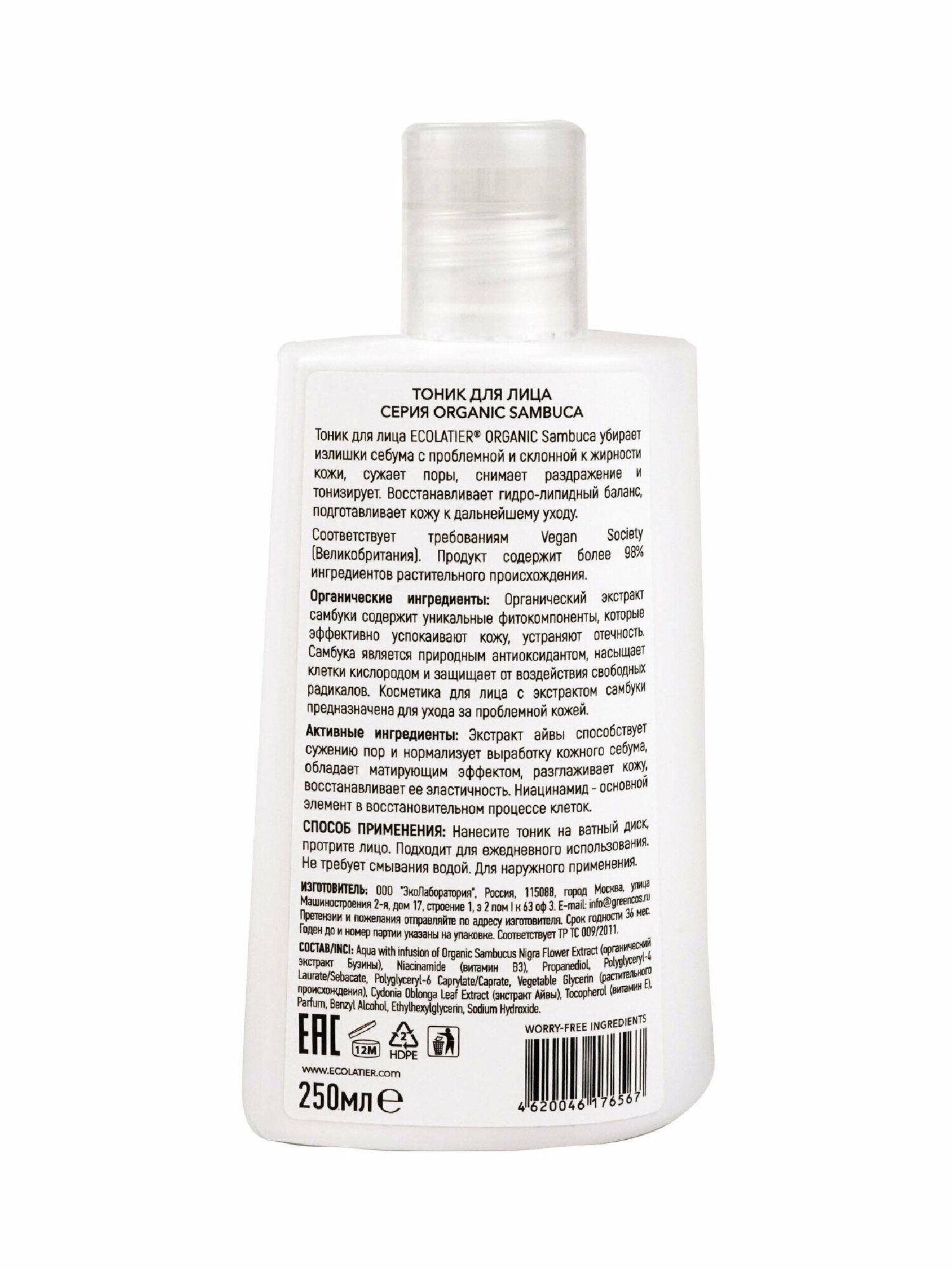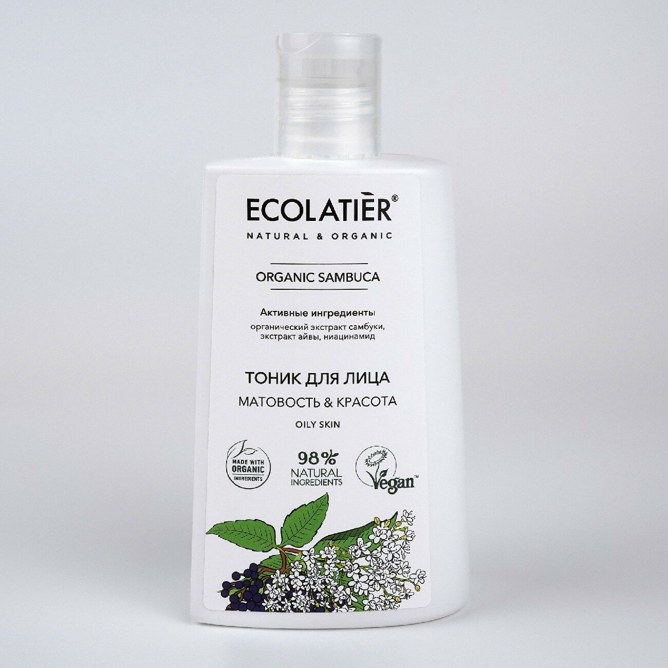 Тоник для лица ECOLATIER ORGANIC Sambuca убирает излишки себума с проблемной и скпонной к жирности кожи, сужает поры, снимает раздражение и тонизирует.