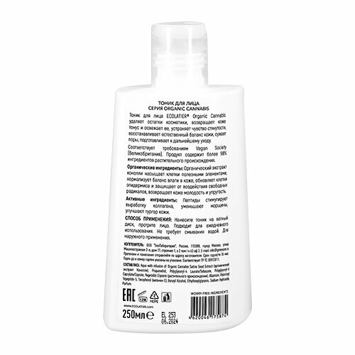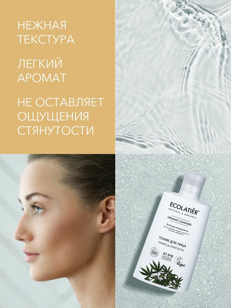 Тоник для лица ECOLAТIER® Drganic Cannabls удаляет остатки косметики, возвращает коже тонус и освежает ее, устраняет чувство стянутости, восстанавливает естественный баланс кожи, сужает поры, подготавливает к дальнейшему уходу.