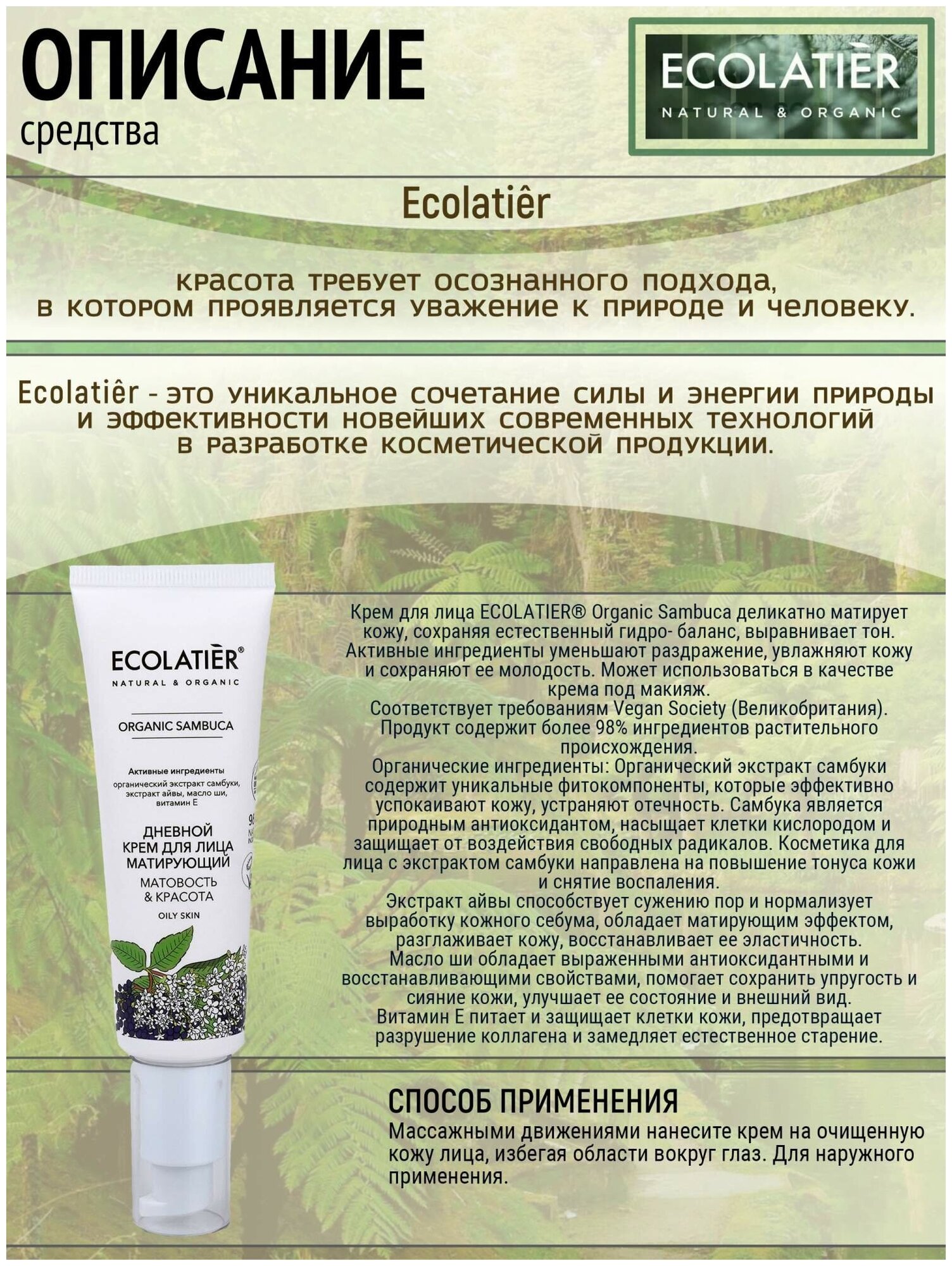 Крем для лица ECOLATIER® Organic Sambuca деликатно матирует кожу, сохраняя естественный гидро- баланс, выравнивает тон.