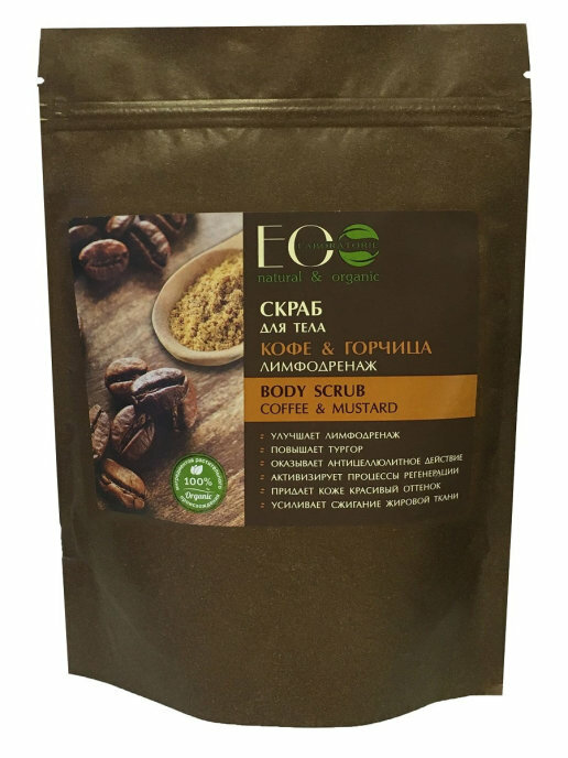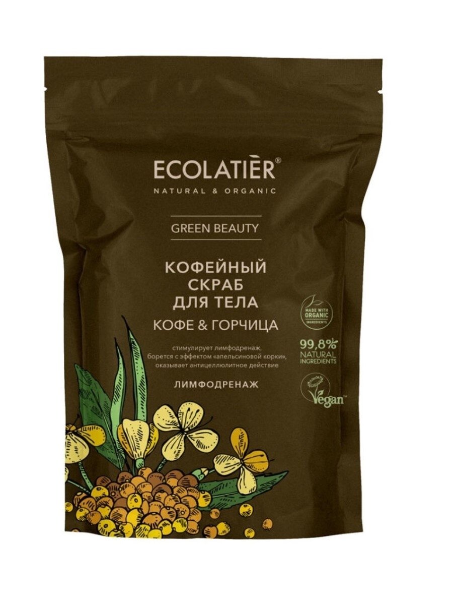 Скраб тела ECOLATIER Кофе & Горчица обладает антицеллюлитным эффектом, стимулирует лимфодренаж и расщепление жировых отложений, нормализует обменные процессы на клеточном уровне, повышает эластичность кожи.