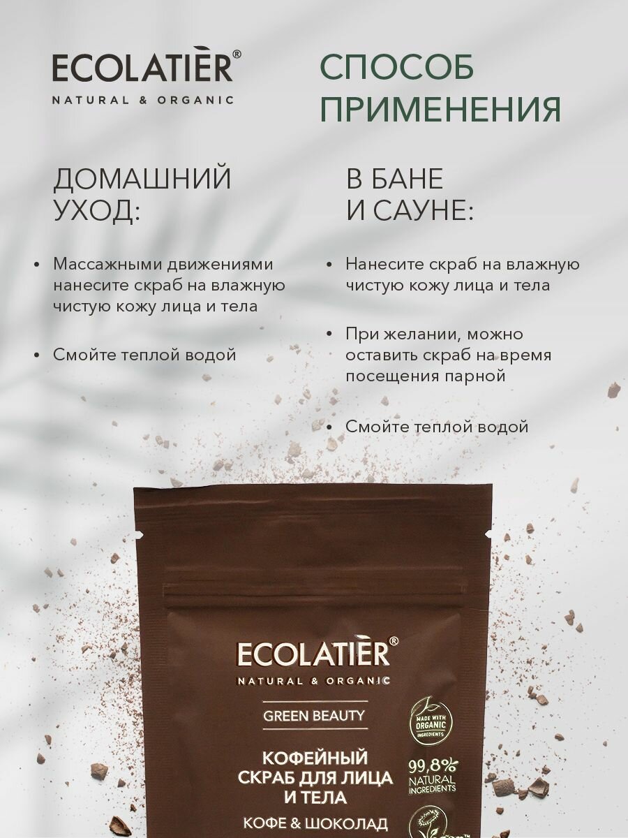 Скраб для лица и тела ECOLATIER Кофе & Шоколад совмещает тонизирующий эффект кофейного скраба и разглаживающее действие шоколадного обертывания, обеспечивает роскошный уход и истинное наслаждение.