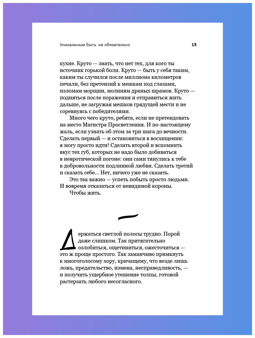 В этих текстах много сочувствия, юмора, нежности, глубины и настоящей жизни - жизни, где отчаяние уже содержит в себе оттенки надежды, где не обязательно быть уникальным и где звучит только наша, ни с чем не сравнимая музыка. Жизнь нередко "заслуживает иронии, а не слез" - но она стоит того, чтобы ее любить. Эта книга - дверь, за которой можно посмотреть на себя по-новому. А можно просто выдохнуть и набраться сил.