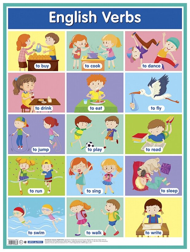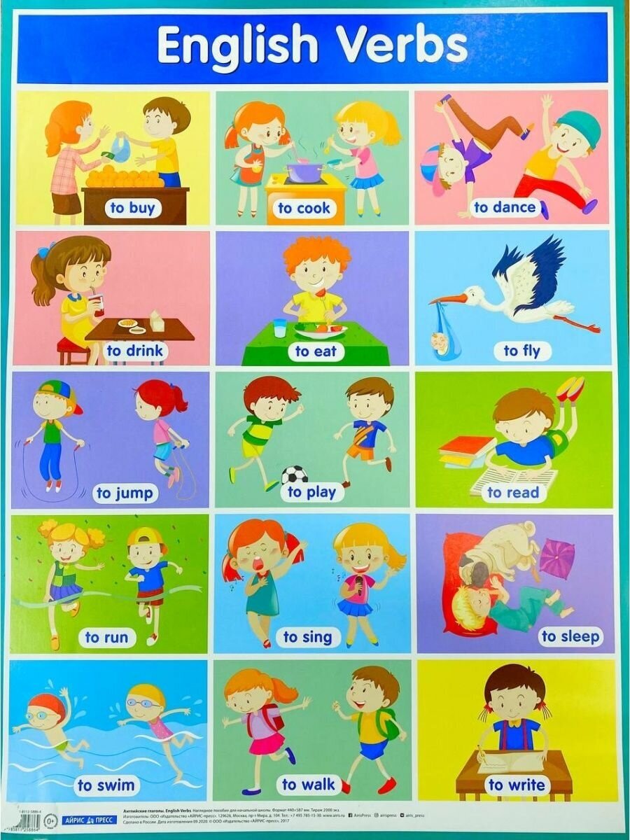Это наглядное пособие посвящено теме "Английские глаголы". На плакате 15 английских глаголов, каждый из которых проиллюстрирован картинкой и подписан. Понятные и узнаваемые изображения помогут быстро и легко запомнить английские глаголы из лексики начальной школы.