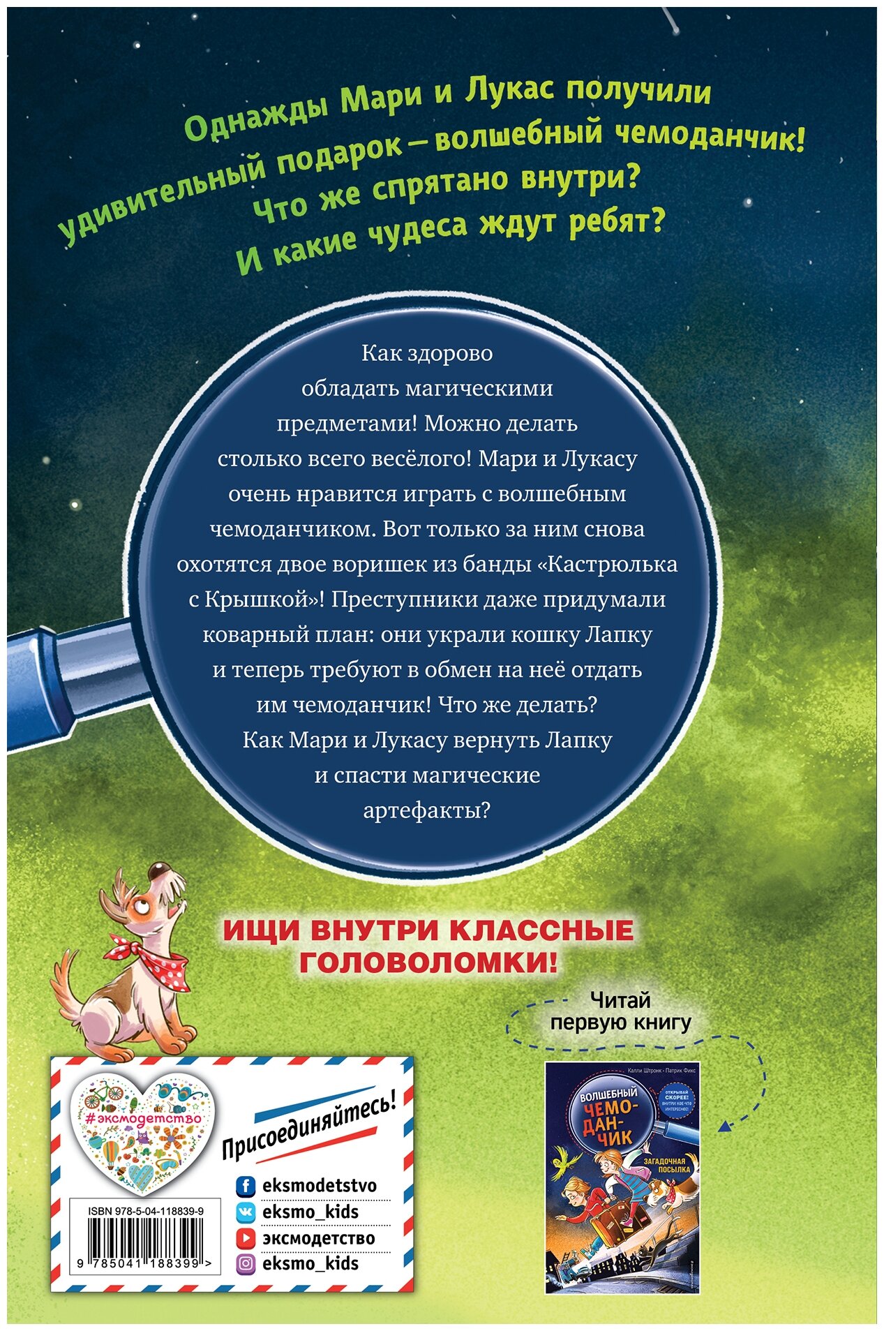 По жанру это детектив, весьма примитивный, тут с самого начала читатель знает кто злодей. Ими оказываются парочка мошенников Дорис Крышкинс и Теодор Кастрюлькинс из банды под названием "Кастрюлька с Крышкой". Они охотятся за волшебным чемоданчиком и артефактами из него(волшебная лупа , ручка,шляпа и карта. ), которые находятся у главных героев брата и сестры Лукаса и Мари. А так как злоумышленники не отличаются умом и сообразительностью, для них это то ещё сложное дельце. Чего они только не придумывали, даже похищение питомца кошки Лапки организовали. Но дети ловко провели их вокруг пальца и спасли свою любимицу.