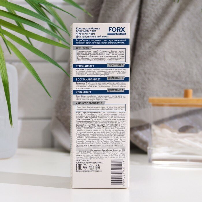 Крем для бритья FORX MEN CARE SENSITIVE SKIN для чувствительной кожи, 50 млУспокаивающий эффект: крем для бритья FORX MEN CARE SENSITIVE SKIN с натуральными экстрактами ромашки и календулы, витаминами А и Е обеспечивает успокаивающий эффект и уменьшает раздражение, жжение, царапины и порезы во время бритья.Легко распределяется по коже: крем для бритья легко распределяется по коже и смягчает ее перед бритьем, создавая тонкий защитный слой между лезвием и кожей.Снижение трения: крем для бритья уменьшает трение, что делает бритье более комфортным и приятным.Объем: 50 мл.Состав: вода (Aqua), стеариновая кислота, гидроокись калия, глицерин, лауретсульфат натрия, токоферилацетат, ретинола пальмитат, экстракт ромашки, экстракт календулы, пропиленгликоль, ароматизатор (парфюм), метилизотиазолинон.Страна бренда: Россия.FORX MEN CARE – это профессиональное средство для бритья, разработанное специально для чувствительной кожи. Крем обеспечивает комфортное и безопасное бритье, делая его приятной и комфортной процедурой.