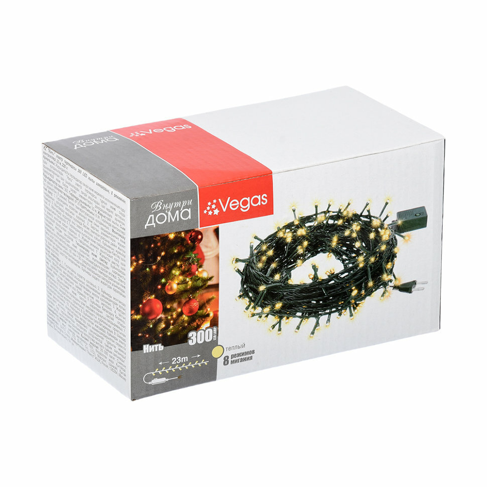 Электрогирлянда новогодняя Vegas Нить Теплое свечение светодиодная 300 ламп 30м КИТАЙ