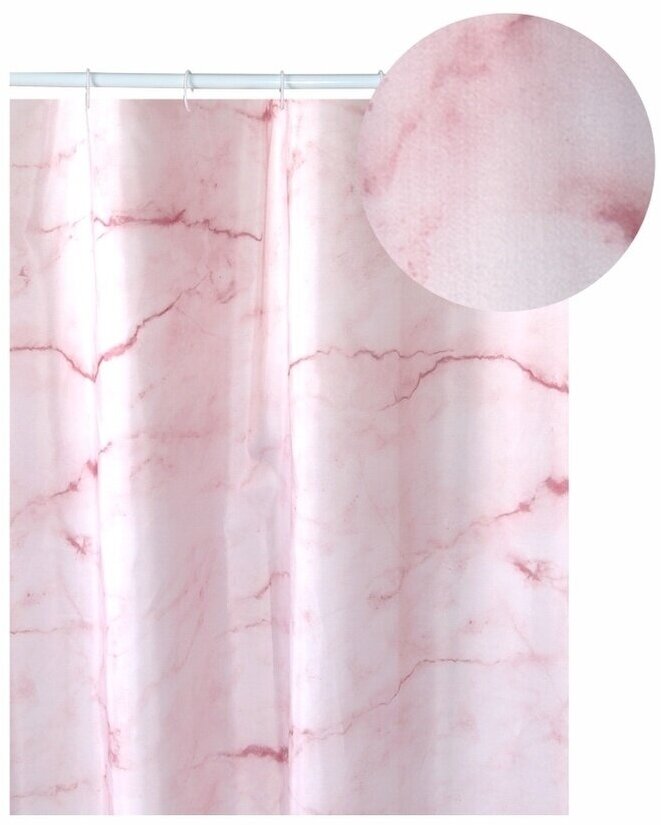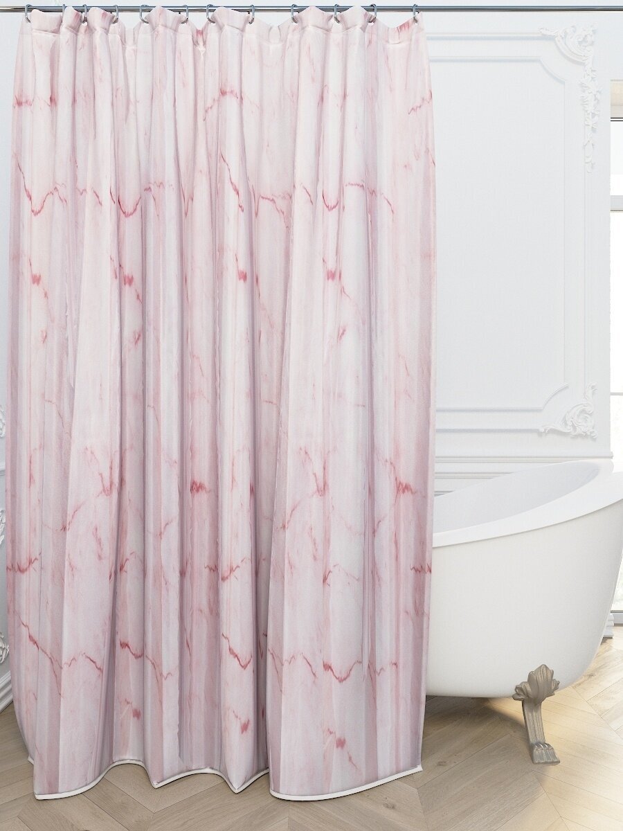 Занавеска для ванной «Розовый мрамор» оснащена пластиковыми кольцами для навешивания на штангу, а значит, вам не нужно будет приобретать их дополнительно.